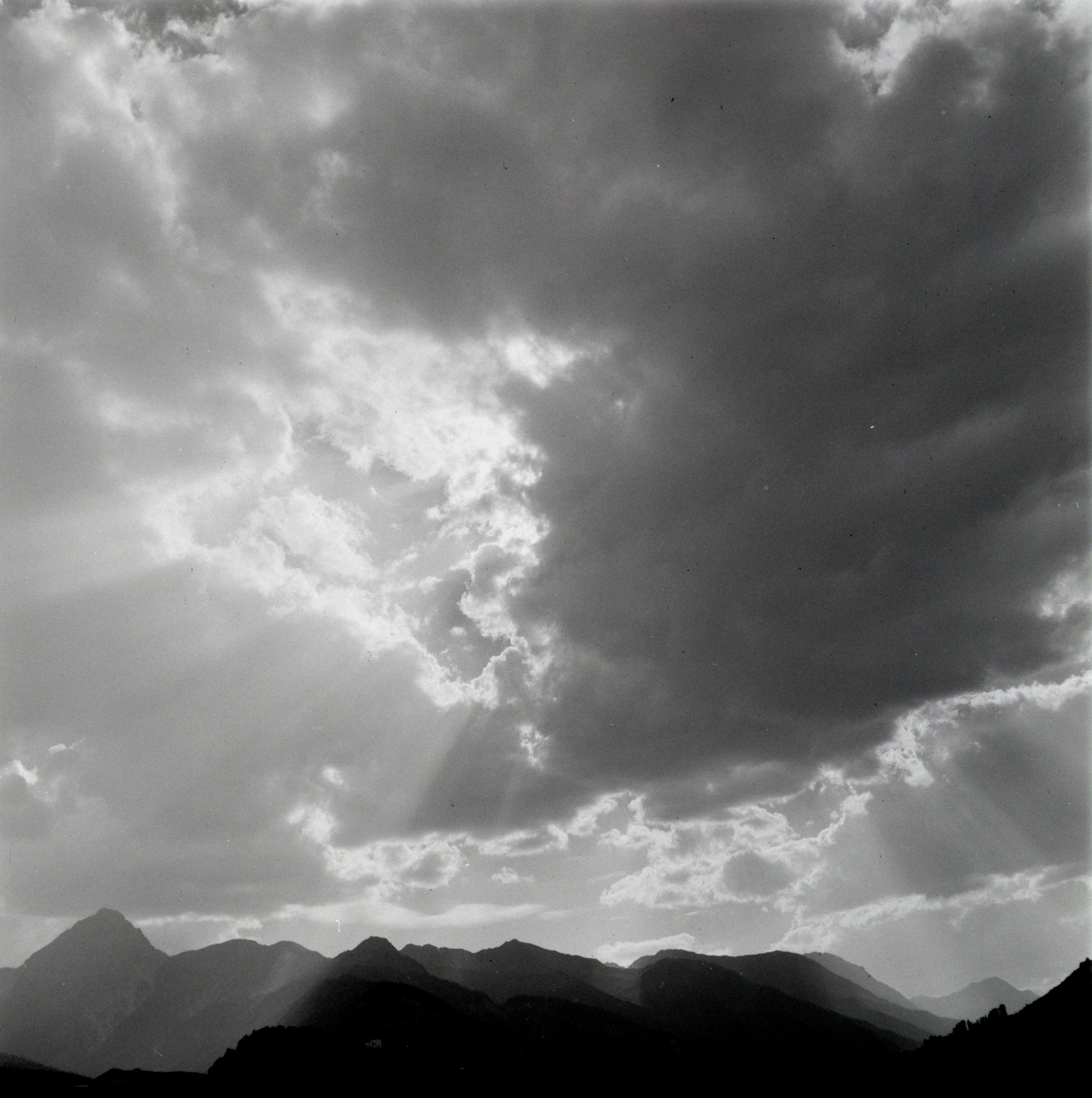 [Sonnenstrahlen brechen durch die Wolken über einer Bergkette im Unterengadin]