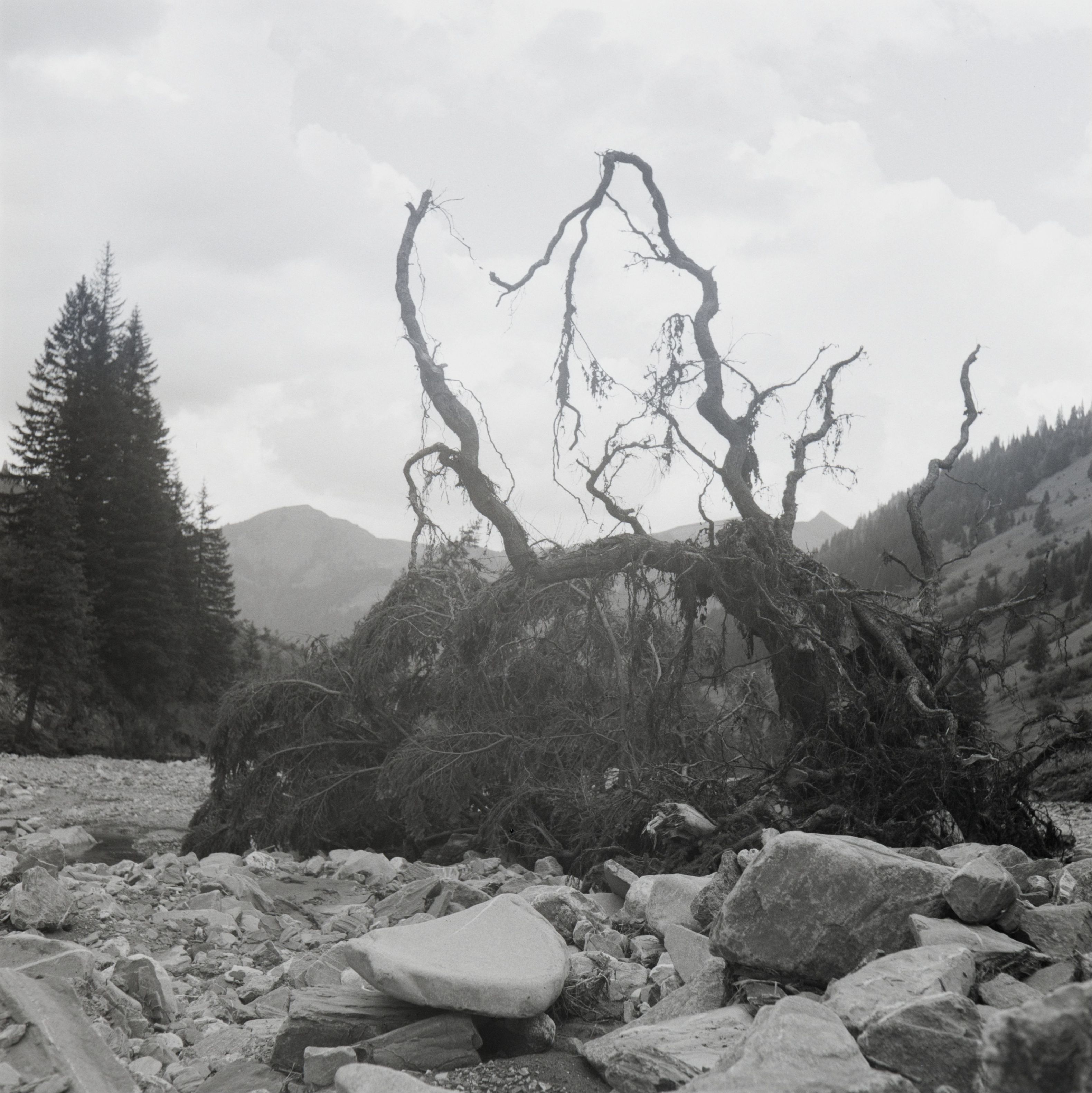 [Unwetterschäden: Flussbett mit entwurzelten Bäumen]