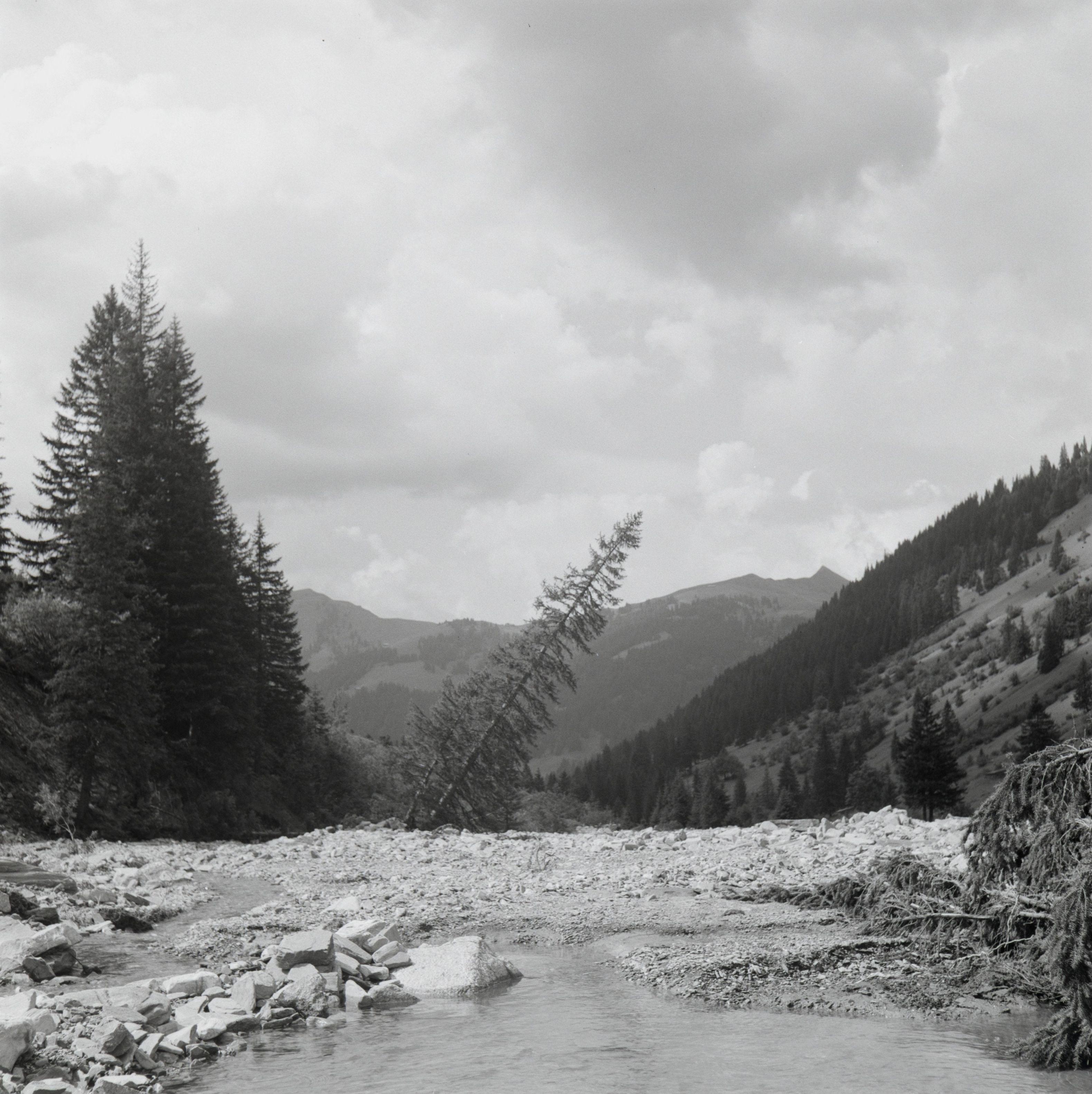 [Unwetterschäden: Flussbett mit entwurzelten Bäumen]