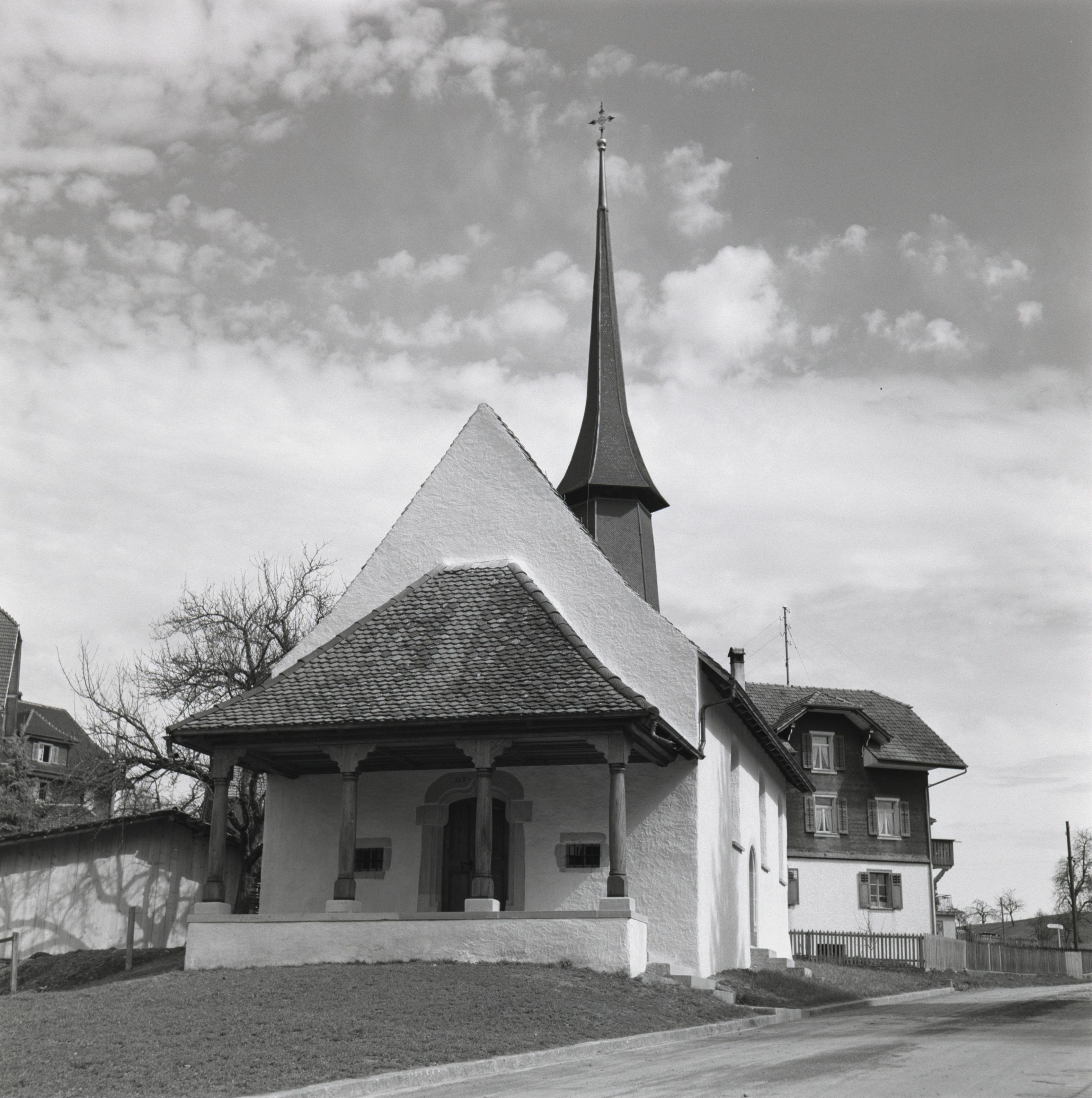Beim Bild befindet sich folgende Notiz: OL 12 - 25Kirchbühl ob Sempach April 1949 [Bleistiftskizze eines Kreuzes]