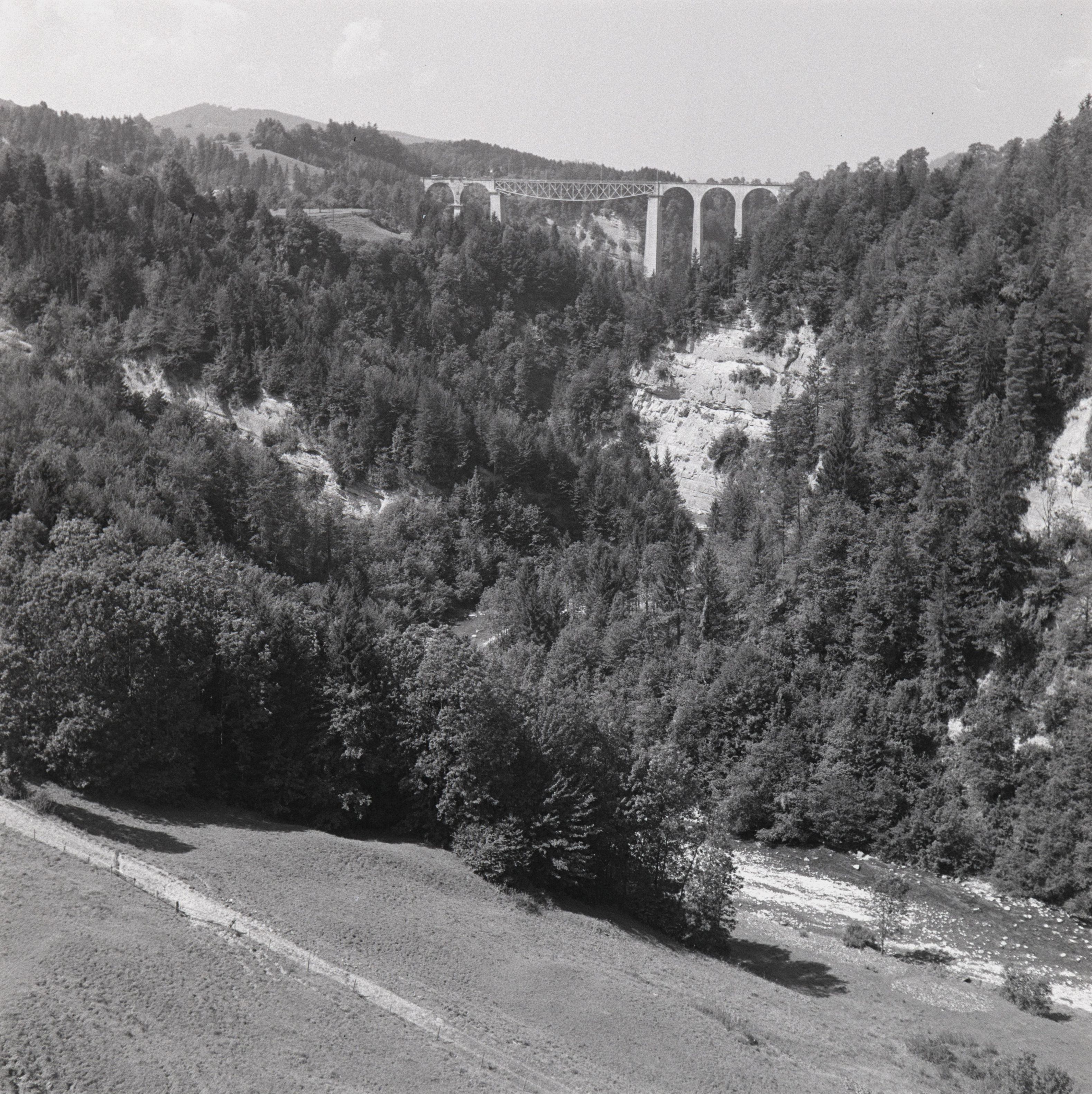 [Die Brücken von Bruggen: Im Hintergrund das Sitterviadukt der SOB]