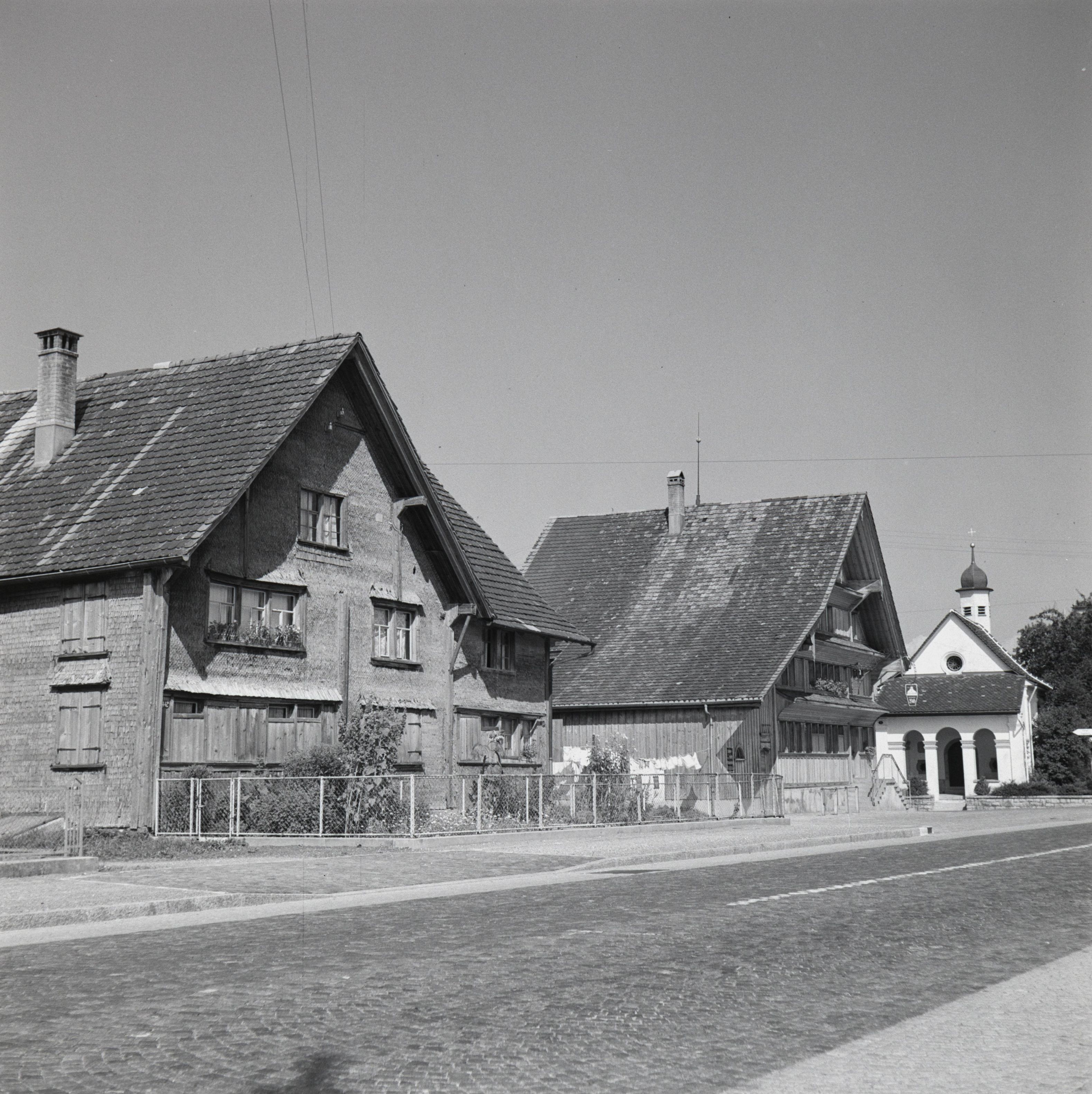 [Holzhäuser und Kapelle]
