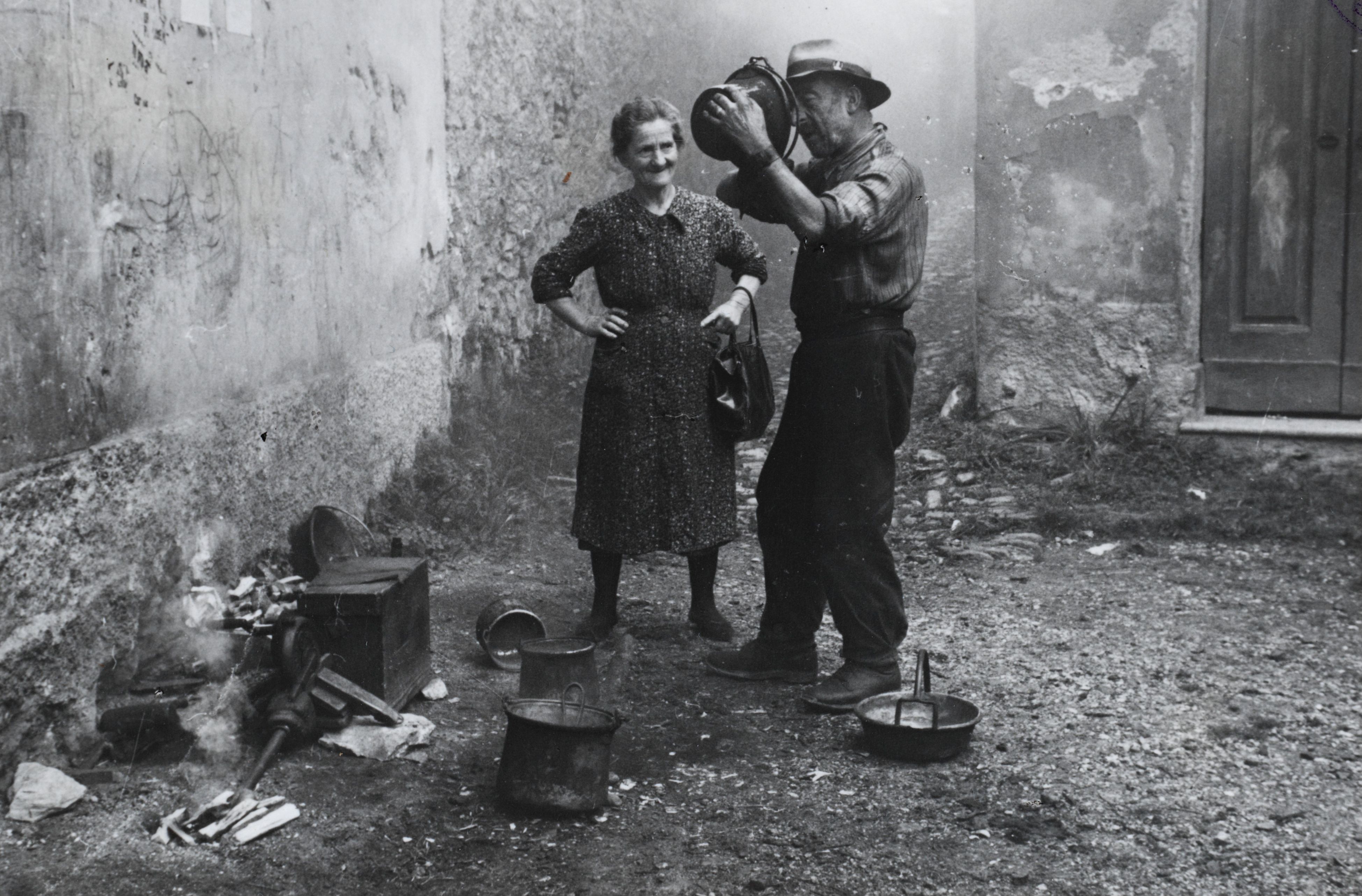 c) Das Feuer wird vorbereitet. Die "Kiste", worauf der Kesselflicker sitzt, ist ein Blasebalg. Die rechte Hand versetzt ihn durch Drehen in Tätigkeit.