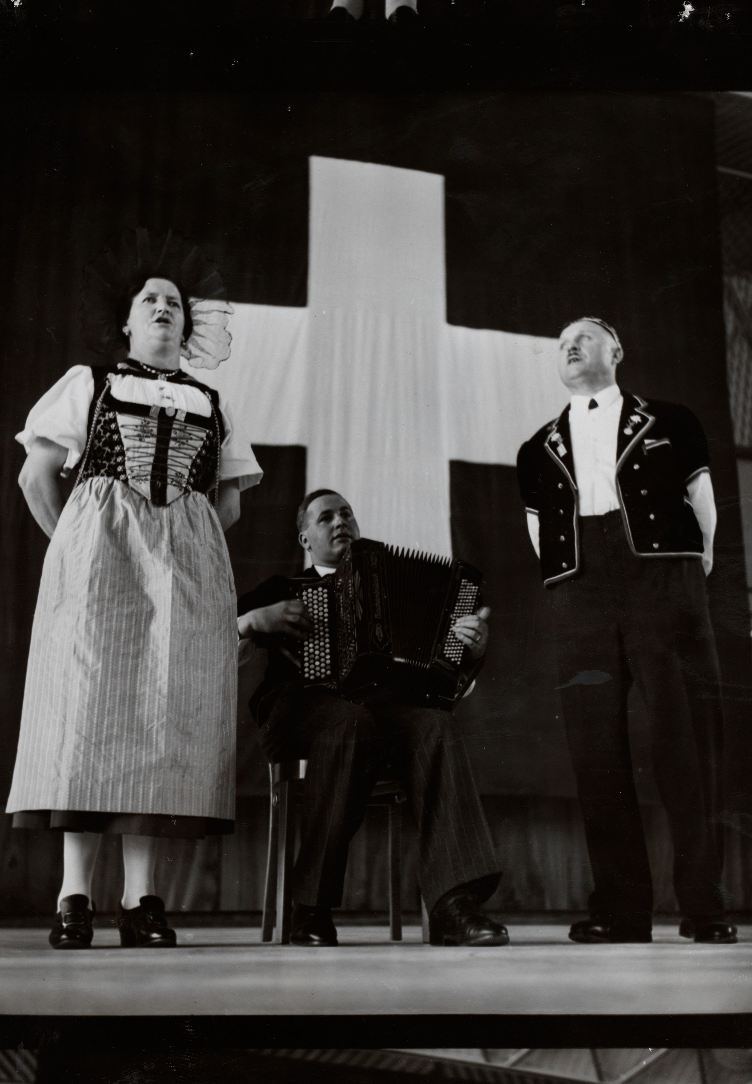 Notiz beim Bild: Musikfeste. Das 6. Eidg. Jodlerfest in Zürich. Von den Wettgesängen im Kongresshaus: Anna Spühler und Willy Rubin (Zürich), Duett mit Handorgelbegleitung "Mys Schwyzerland".Photo: Photopress. Reprod. recht: Photopress Datum: 1939; ZUERICH ZH; E 1042 a B 2421