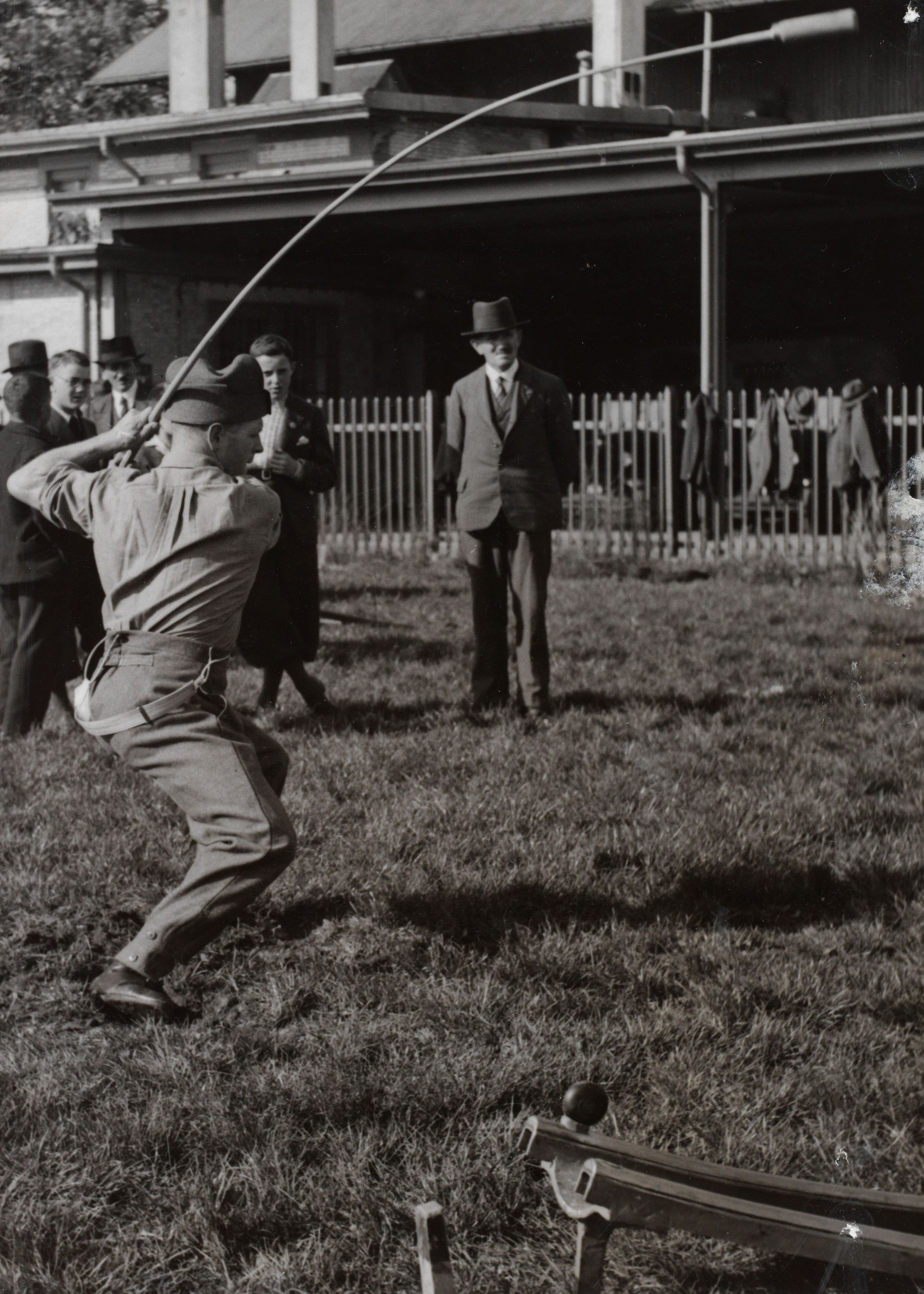Am Sonntag trafen sich die schweizerischen Hornusser zu ihrem Grosswettkampftag, um im friedlichen Messen der Kräfte in einem der ältesten volkstümlichen Spiele der Schweiz die Besten zu erküren. Wie ernst es die Mannen mit Schindel und Stecken mit den Konkurrenzen nehmen, beweist dieses Bild. Aus dem Aktivdienst ist dieser Soldat zum Wettkampf geeilt, um der eigenen Sektion seine Kraft zur Verfügung zu stellen. Eben holt er zum Schlag aus und im nächsten Moment saust der Stecken mit pfeifender Wucht auf den im Vordergrund auf dem Bock liegenden Hornuss.
