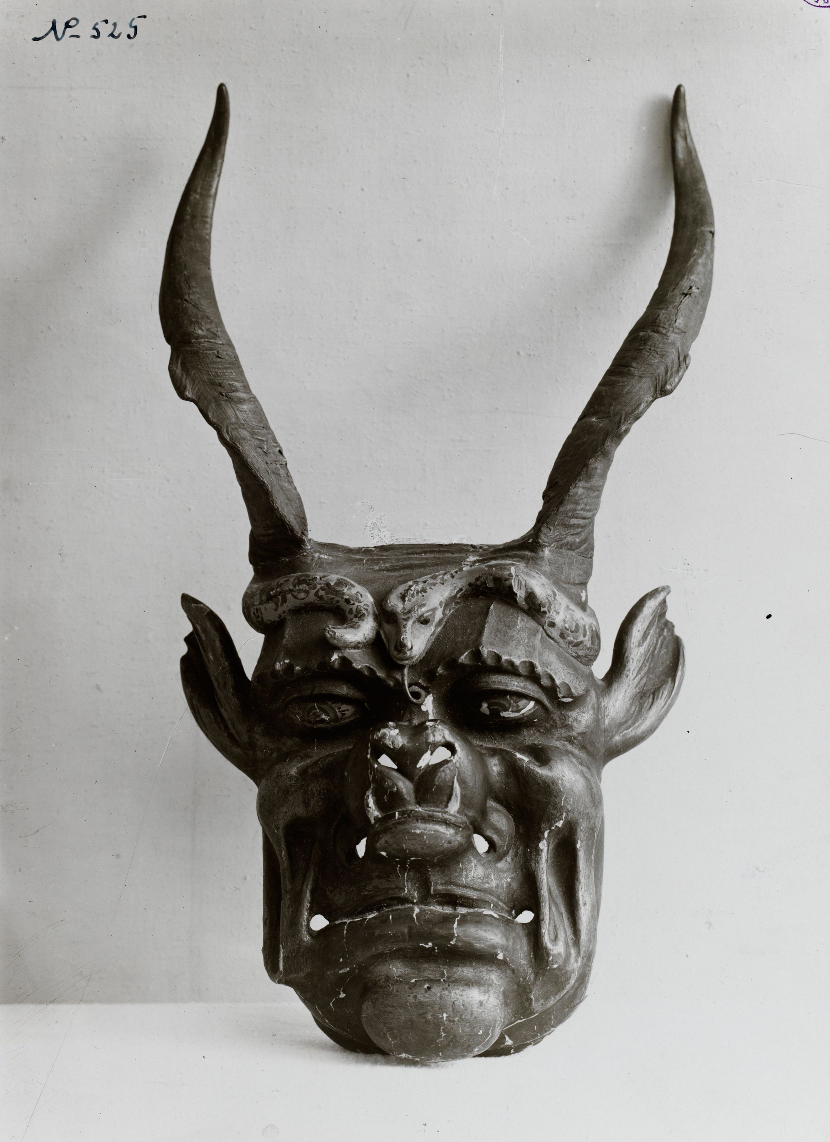 Notiz beim Bild: Maske aus Samaden. Besitzer: Theodor Fischer, Luzern 17 Haldenstrasse31 cm hoch, 62 cm maske