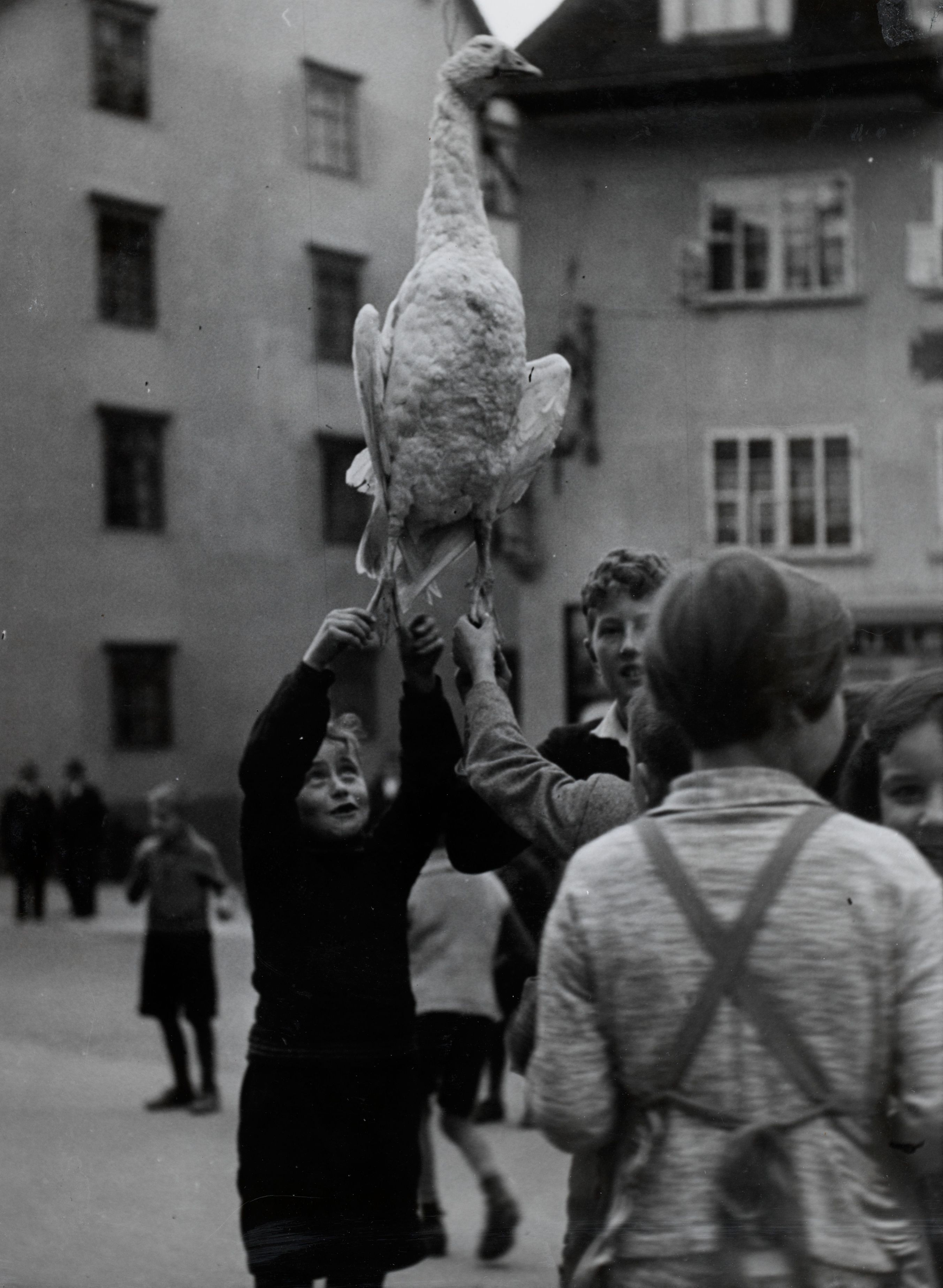 Notiz beim Bild: Der "Gans-Abhauet" in Sursee. Vor dem eigentlichen Gansabhauen bildet die aufgehänte Martins-Gans auf dem Rathausplatz das Belustigungsobjekt der Schuljugend. Photopress, Zürich 1938; No 10 E 743