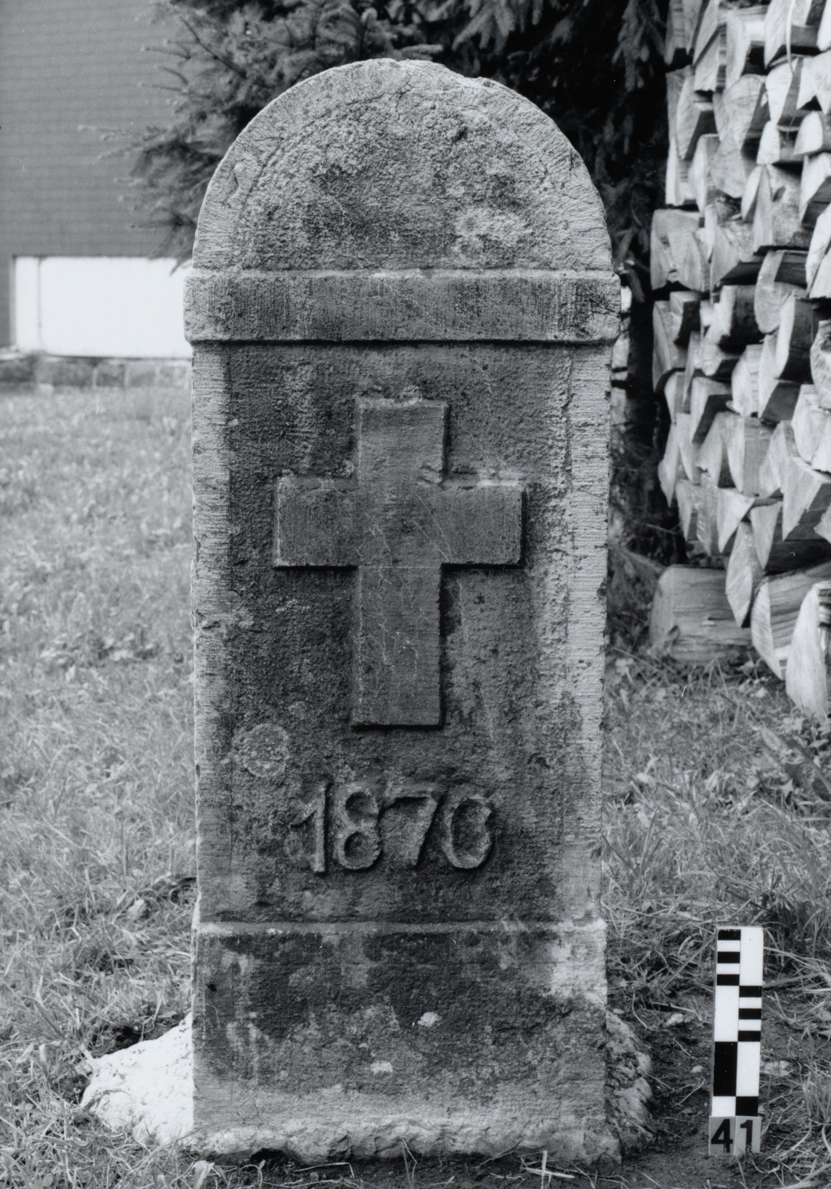 [Kreuzrelief und Jahreszahl auf Stein]