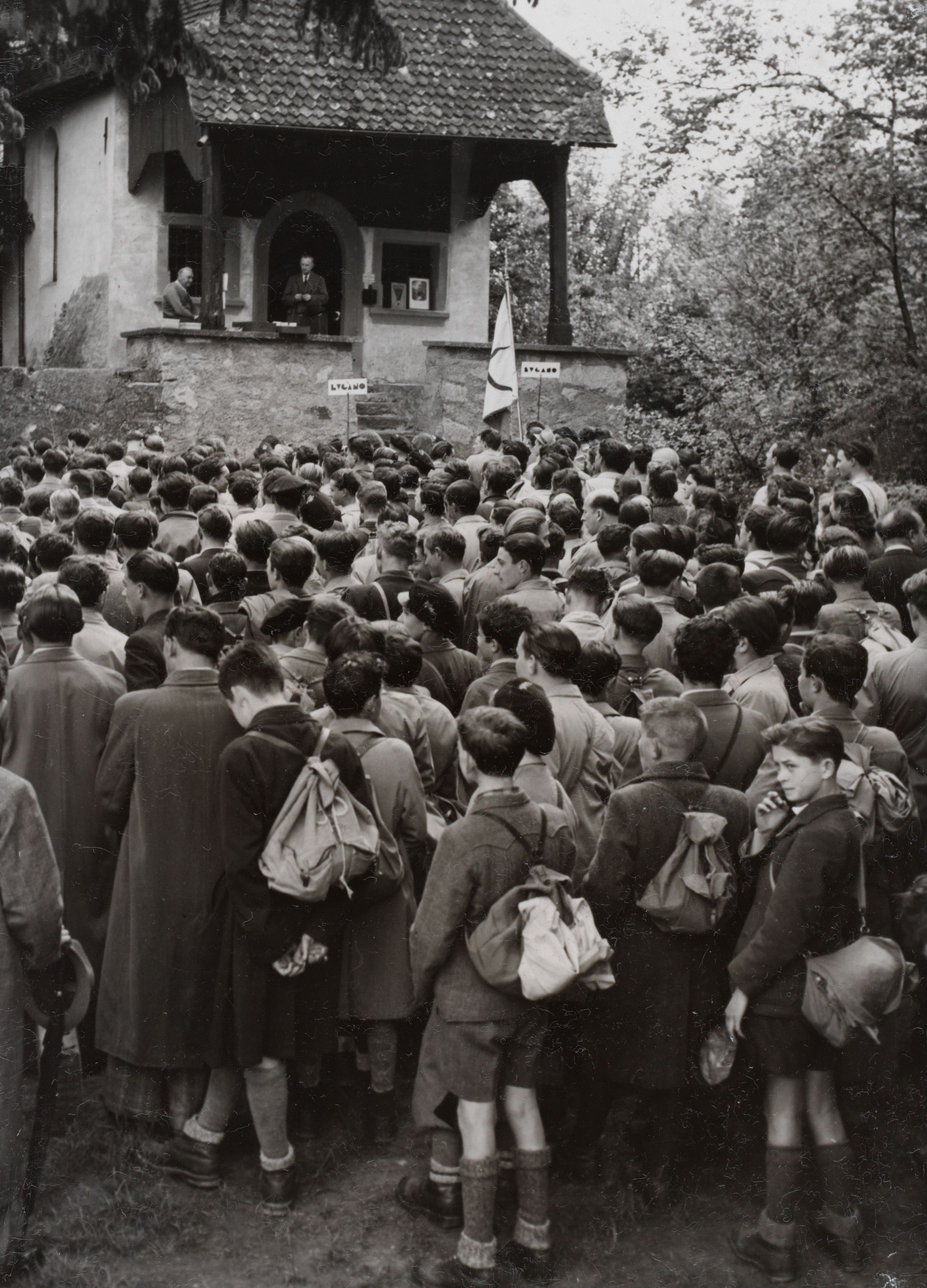 Ein eindrucksvolles Bild von der Wallfahrt der Tessiner Schüler zu den historischen Stätten er Innerschweiz anlässlich der 650. Jahrfeier der Eidgenossenschaft. Vor der Tellskapelle an der „Hohlen Gasse“ hört unsere heranwachsende Generation aus berufenem Munde die Daten unserer kampfreichen Geschichte.