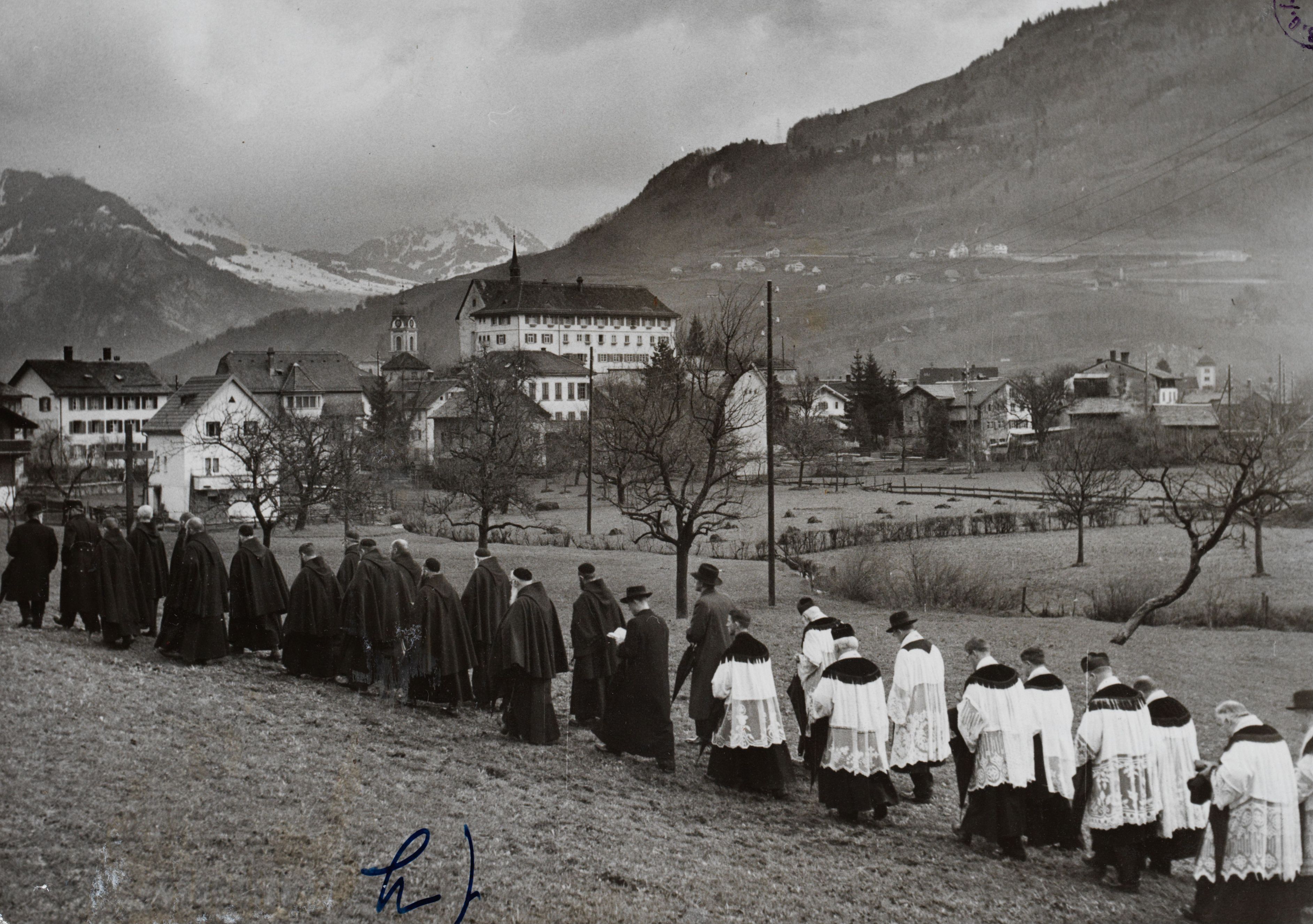 Notiz auf der Rückseite von No. 2364 (SGV_04P_03034): Die Näfelser Fahrt 1940 Am ersten Donnerstag im April wallfahrten die Glarner gen Näfels, um den Sieg der Eidgenossen in der Schlacht bei Näfels im Jahre 1388 feierlich zu begehen. Mehr als je ist heute Grund vorhanden, des Tages von Näfels zu gedenken, wo ein kleiner Harst von Eidgenossen sich siegreich vor gewaltiger Uebermacht behauptete. Wir zeigen von der diesjährigen Näfelser Fahrt: e./ Der Grossmünsterpfarrer von Zürich, Max FRICK, hält die Festpredigt auf dem Fahrtplatz in Näfels. f./ Die Feier beim ersten Schlachtgedenkstein in Schneisingen, wo Dr. Hefti Haab das Wort ergriff. Prächtig sind die bunten Kirchenbanner. g./ Als Ehrengast wohnte der Feier Oberstdivisionär Flückiger bei. Die Spitze der Fahrtprozession, die alljährlich von Militär gebildet wird, schreitet an Oberstdiv. Flückiger vorbei. h./ Von Schneisingen her schreitet die Prozession den Gedenksteinen entlang nach Näfels. PHOTOPRESS Schweizer Bilderdienst Zürich-Bern-Genève