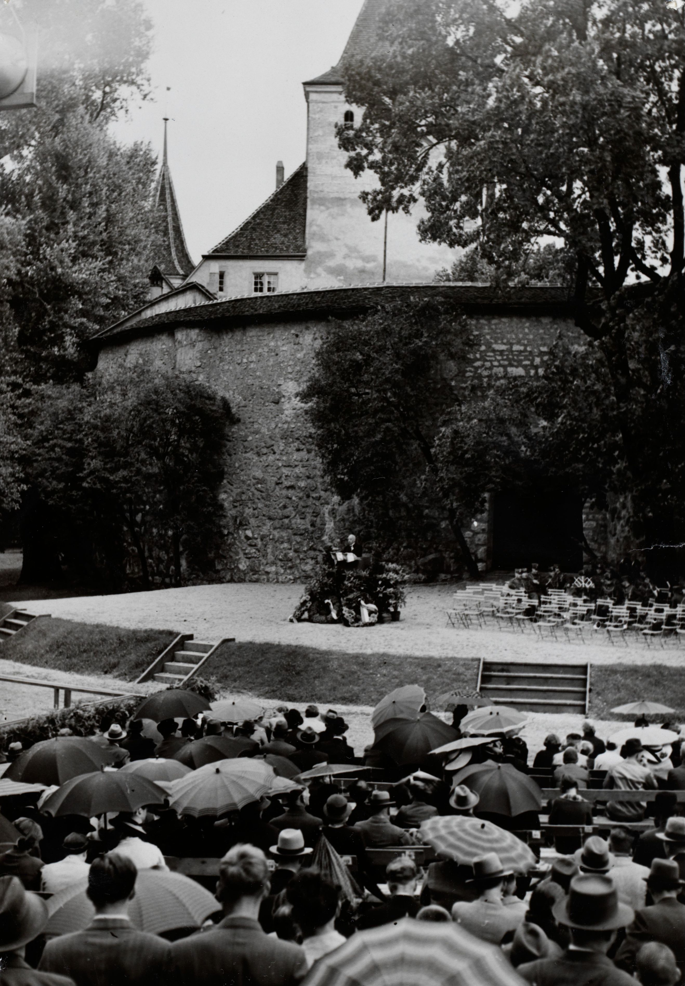 Notiz beim Bild: 600 Jahrfeier des Städtchens NIDAU bei Biel am 21. August 38.Der bernische Regierungsrat GUGGISBERG hält im Schlosshofe die Festansprache. B-N. Photopress Zürich, 1938; No 65 XIV 707