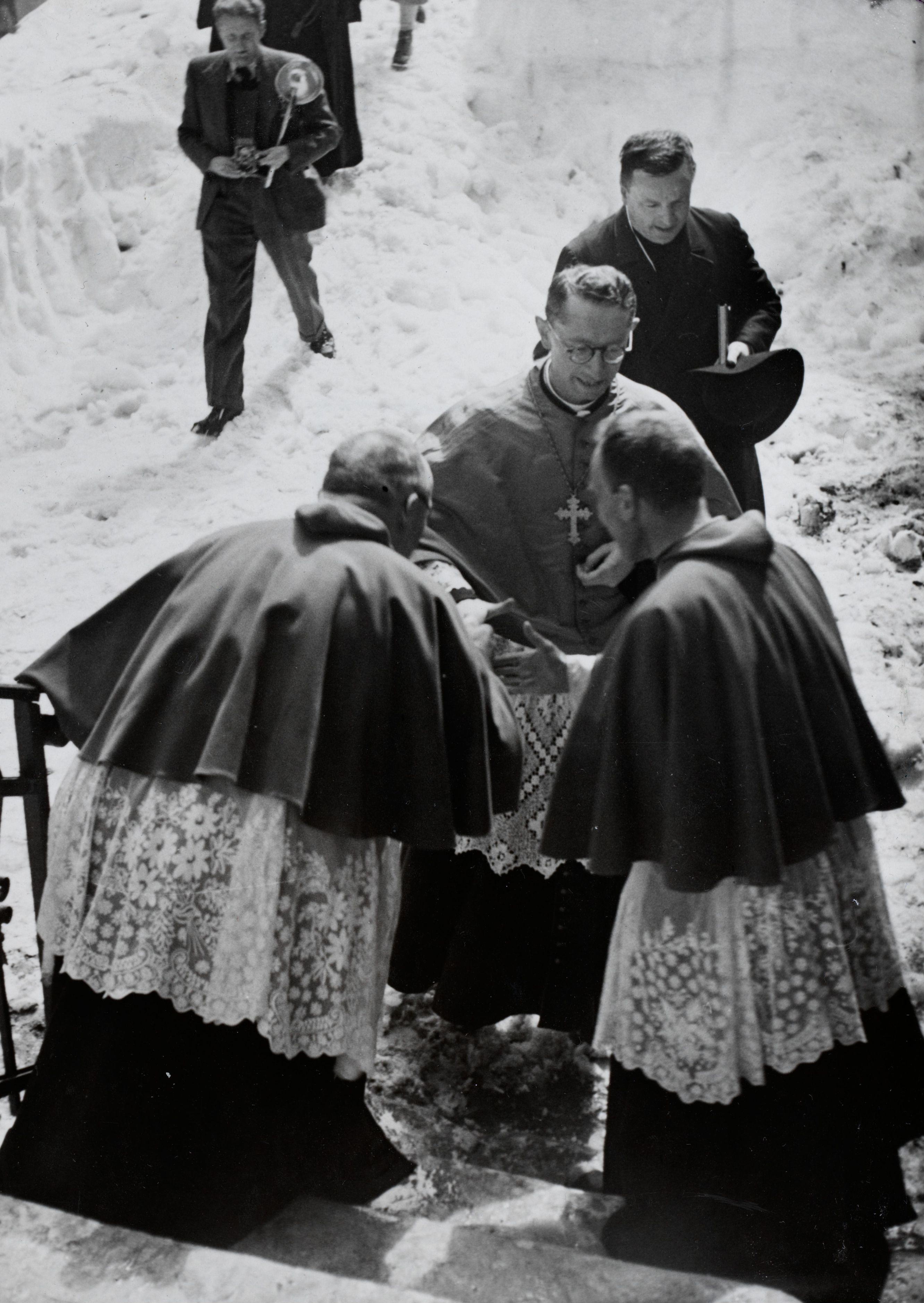 Notiz beim Bild: Der neue ABT des KLOSTERS auf dem GROSSEN St. BERNHARD wird geweiht. Empfang des neuen Abtes auf der Treppe des Hospizes a.d.gr. St. Bernhard.B.N. Photopress Zürich, 1939; No 569 700a