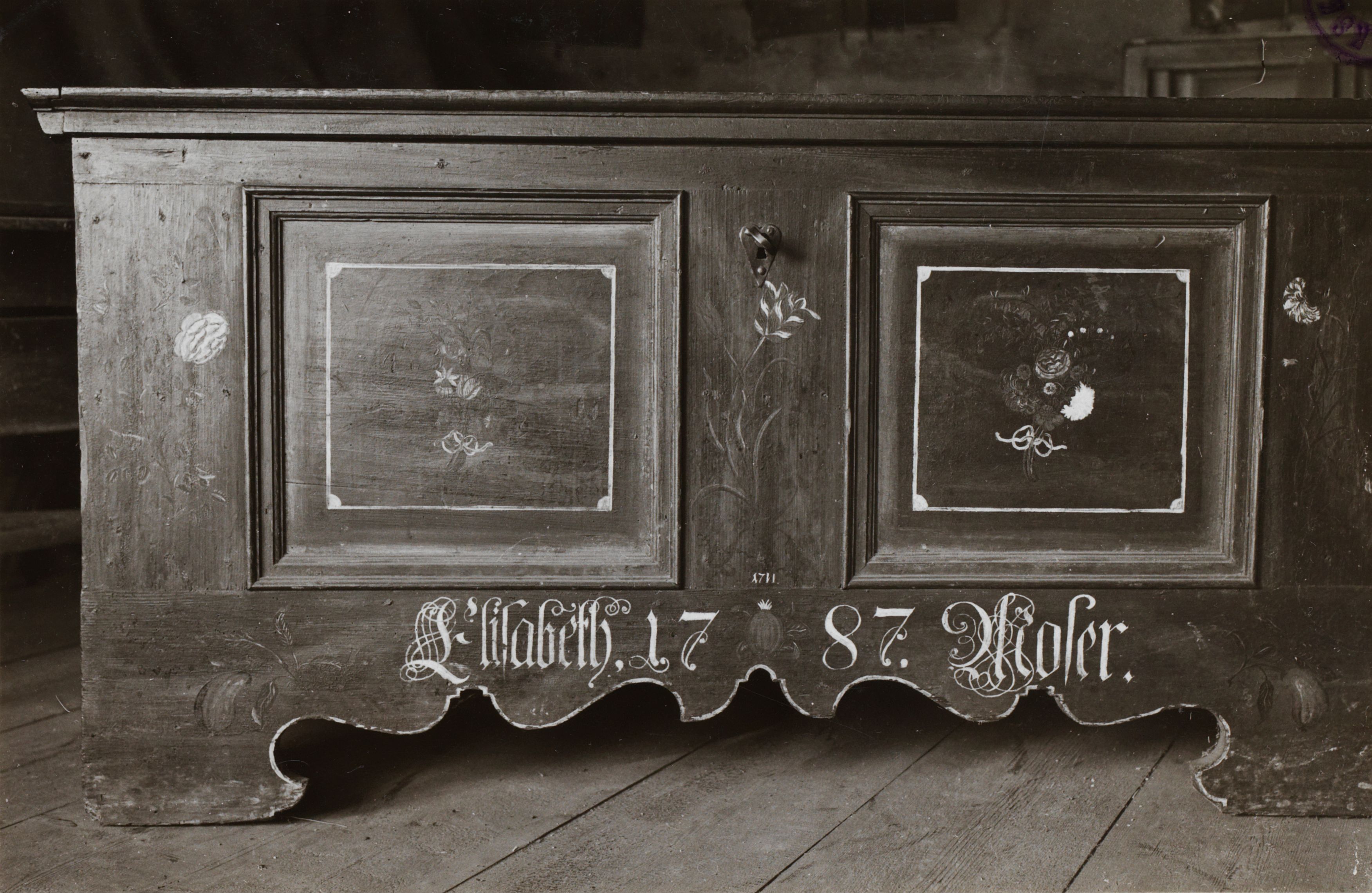 Notiz beim Bild: Haus Fankhauser (Ried) Truhe aus dem Jahre 1711. Uebermalung von 1787. In der Füllung links erkennt man schwach Spuren der ersten Malerei (Rundbogen) [Handschriftlich:] Verzierungen (Möbel); Photo: Rubi, Bern; (vgl. Rubi Bauernmalerei, Berner Heimatbücher, Nr. 13/15) Ried BE; B 2345 E 682