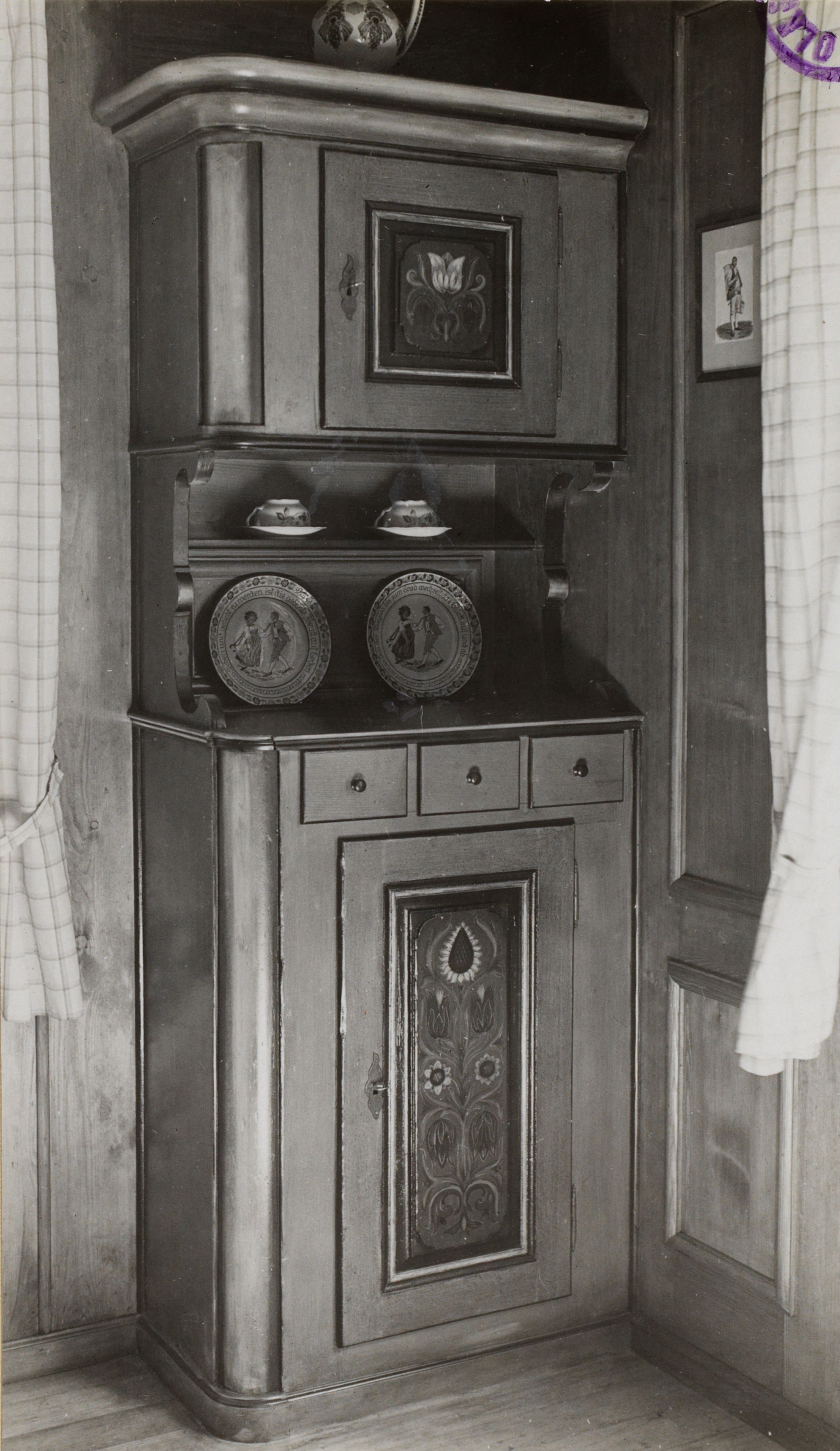 [Handschriftlich:] Verzierungen (Möbel); Photo: Rubi, Bern; (vgl. Rubi Bauernmalerei, Berner Heimatbücher, Nr. 13/15) Mühlehof, Trub BE; B 2349 E 682