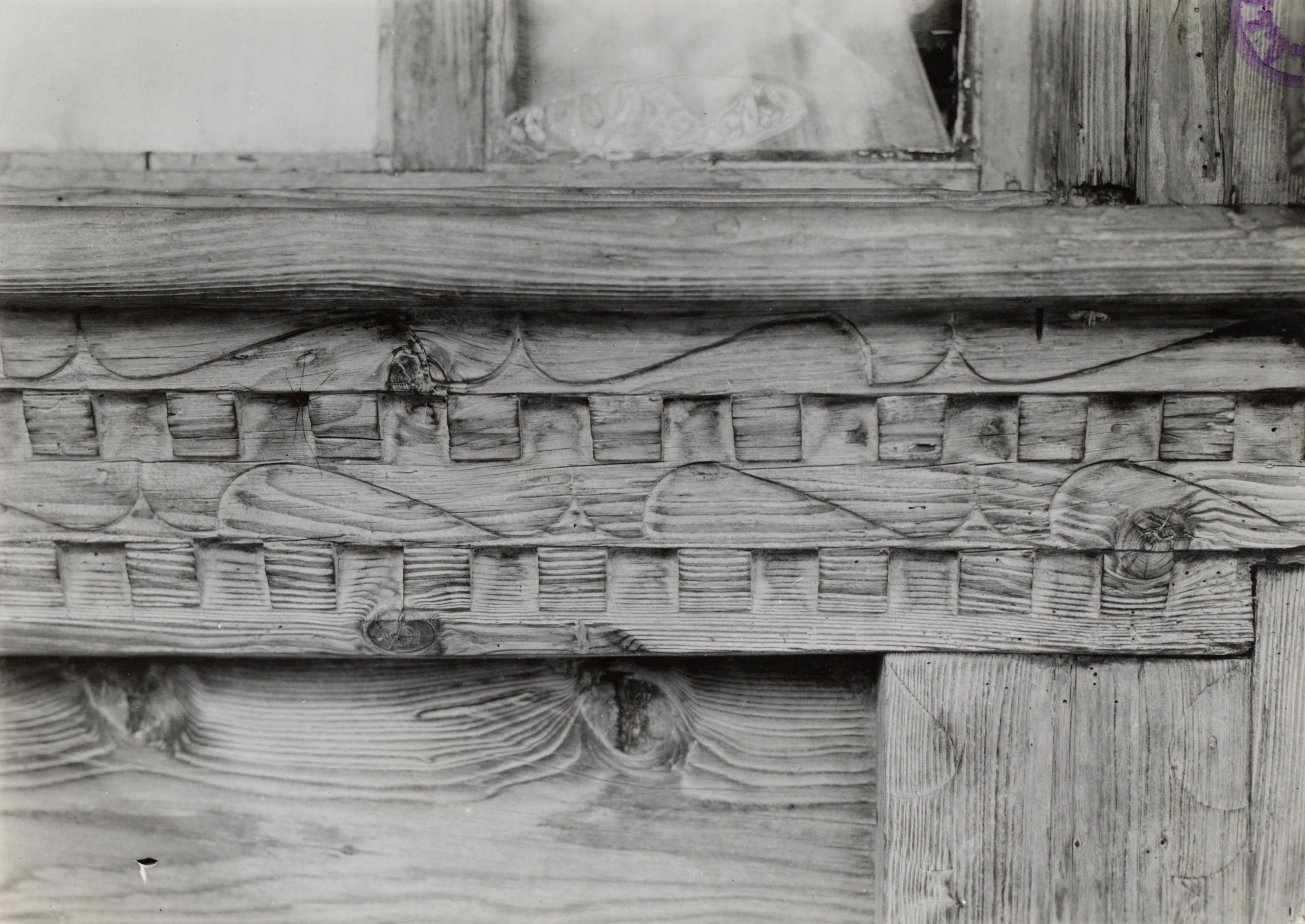 [Handschriftlich:] Verzierungen (Häuser); Photo: Rubi, Bern; Literatur s. Rubi, Volkskunst a. Berner Bauernhaus (Volkstum d. Schweiz, Bd. 3) Basel 1942; Grächwil, Schüpfen; Datum: [leer]; B 2379 E 681