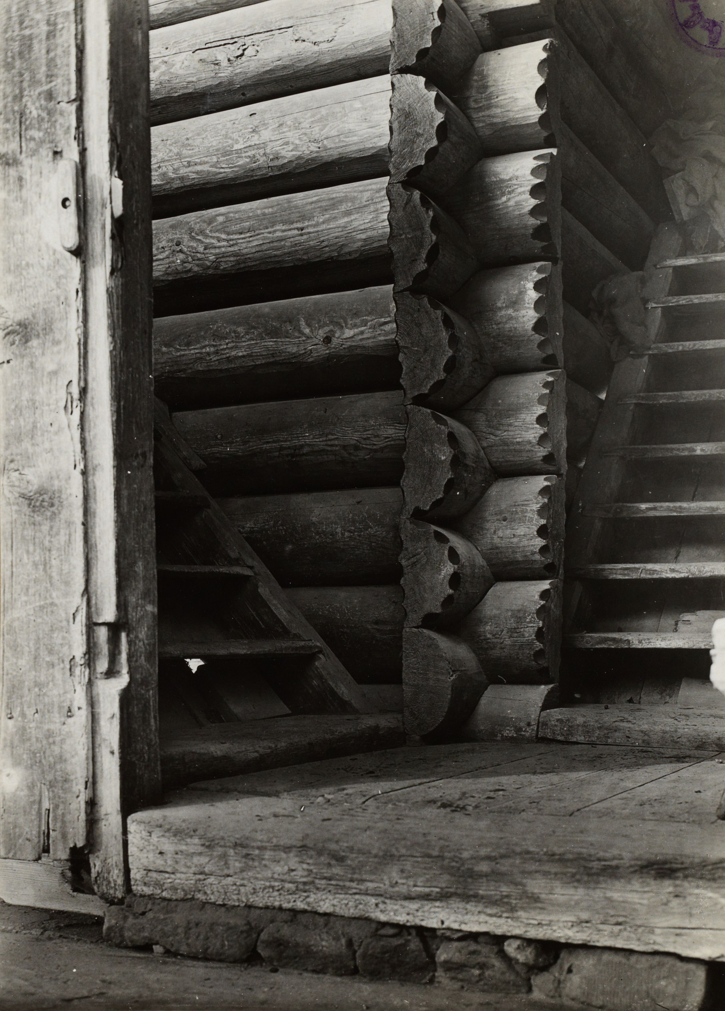 Notiz beim Bild: Speicher Fankhauser. (Ried). Aufgang: rechts zu der westl. Laube, links zu den Türen und nördlichen Lauben. Gwättecke. Ausrundungen rot/schwarz ausgestrichen. [Handschriftlich:]Verzierungen (Häuser); Photo: Rubi, Bern; Literatur s. Rubi, Volkskunst a. Berner Bauernhaus (Volkstum d. Schweiz, Bd. 3) Basel 1942; Ried BE; Datum: [leer]; B 2361 E 681