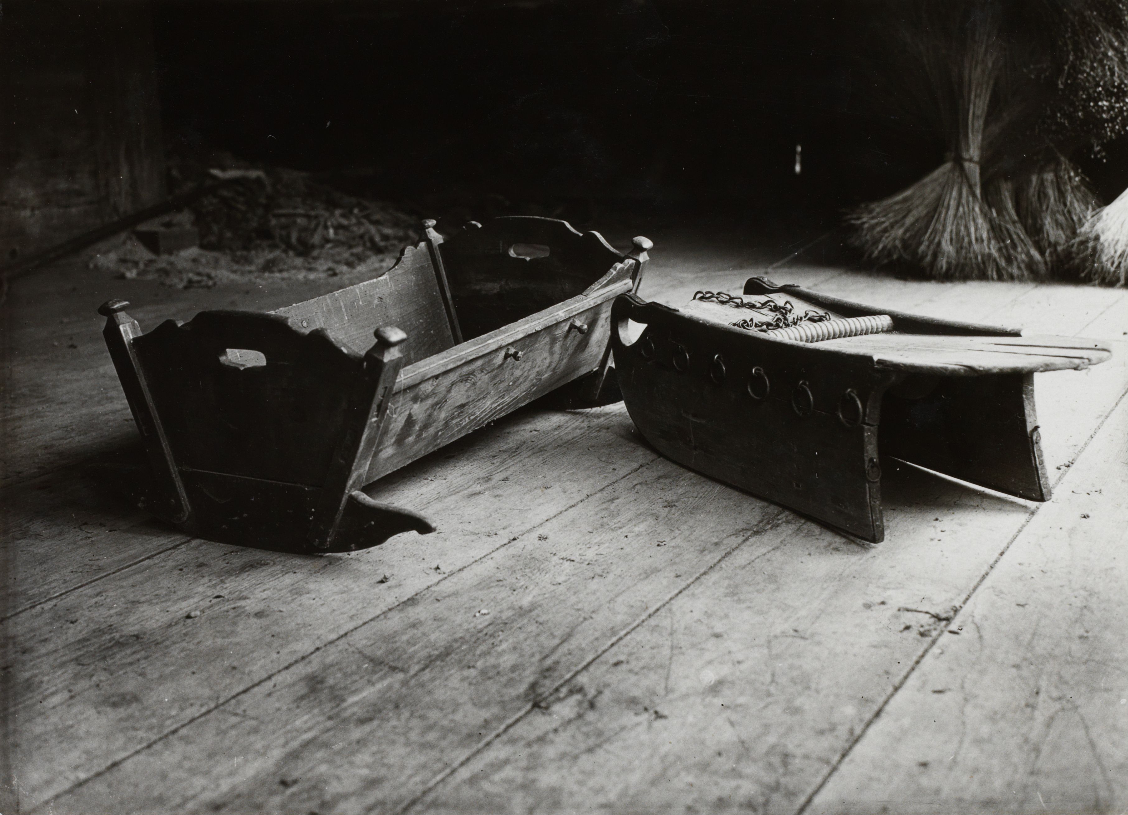 Beim Bild befindet sich folgende Notiz: Dürrgraben, Krummholz. Fam. Sommer. Wiegeli und Füduschlitte (auf der Speicherlaube); [handschriftlich:] Wiege, Dürrgraben (Krummholz) BE, Photo: Rubi, Bern, Datum: [leer]; B 2337 E 508