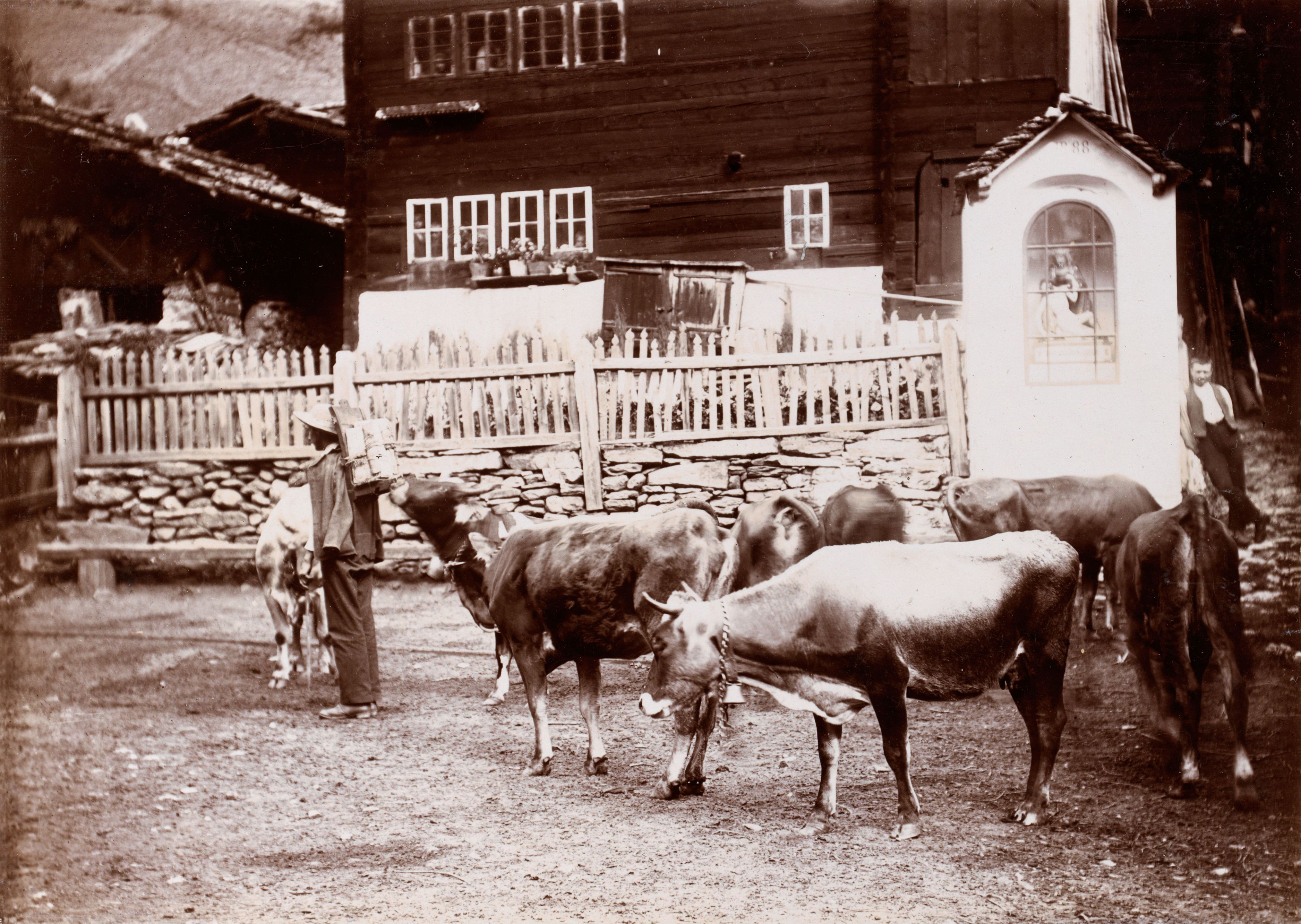 Beim Bild befindet sich folgende Notiz: Abfahrt von der Alp in Binn. Jeder Bauer holt sein Vieh selbst von der Alp und treibt es einzeln heim. Hier steht ein solch verlorner Trupp eines Unverschämten von Mörel, der 50 Cts. für das Photographieren verlangte. Der Mann hat eine Zigergabel am Rücken.; B 3240 E 406