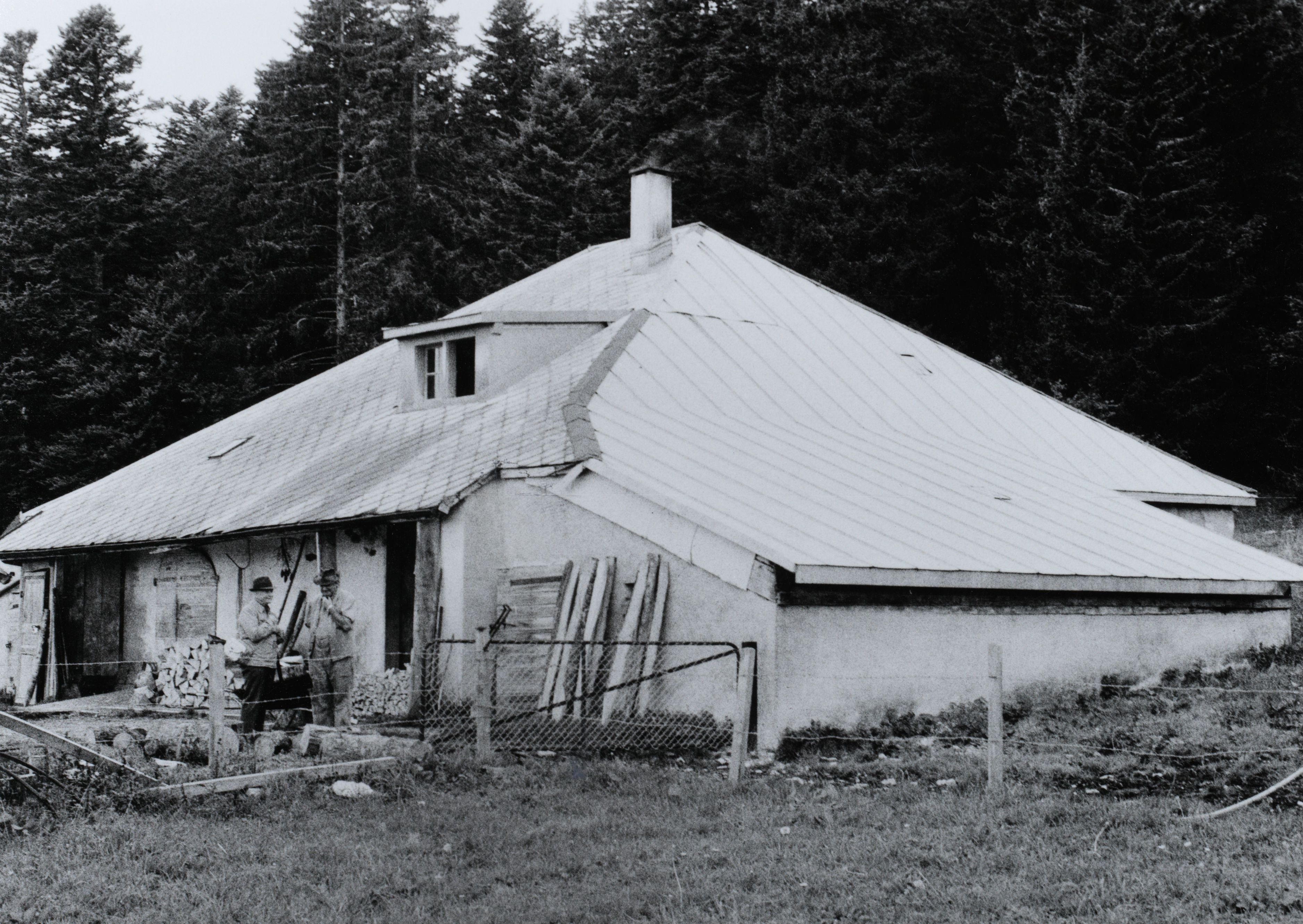 [Gebäude, Architektur, Alphütte, Haus, Mann, Holz, Zaun, Schornstein]