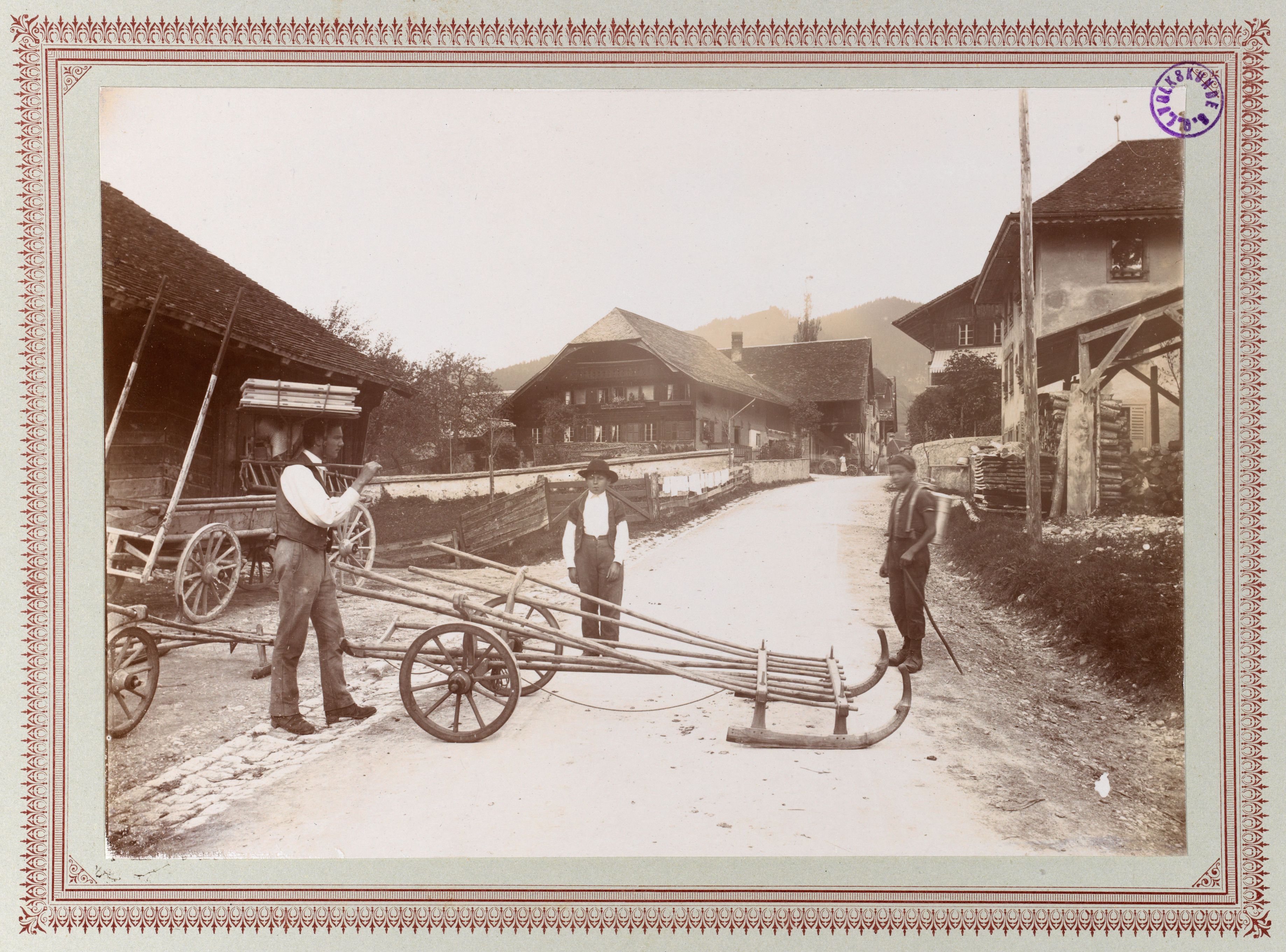 Beim Bild befindet sich folgende Notiz: Una Tscharetta (Charrete) o. Heuwaagenschclitten in Charney, Gruyère. Links ein Träger mit dem "Chäsvogel" oder "Oiseau" einem Traggestell. Rechts ein Sennenbub, der Milch von der Alp holte, mit der "Bouille". B 2434 E 314