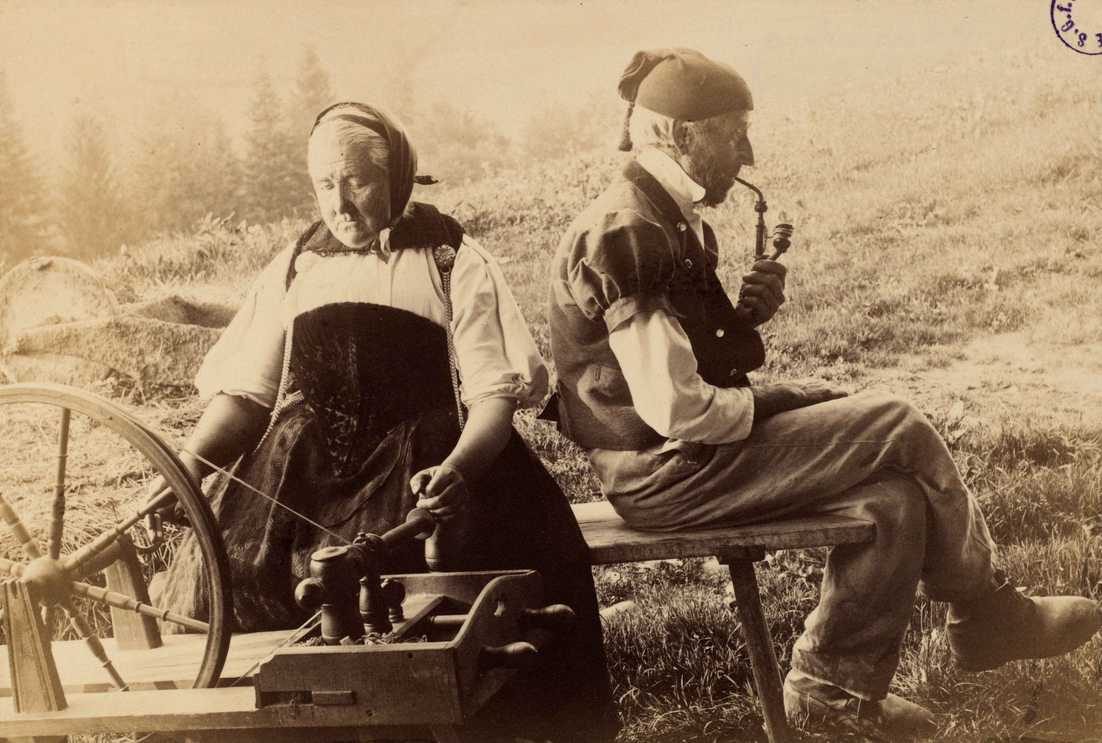 Beim Bild befindet sich folgende Notiz: Am Spinnrad in Guggisberg; Sammlung: Prof. Dr. Ed. Hoffmann-Krayer; Photo ?; Basel, Nov. L936; No 1679 280