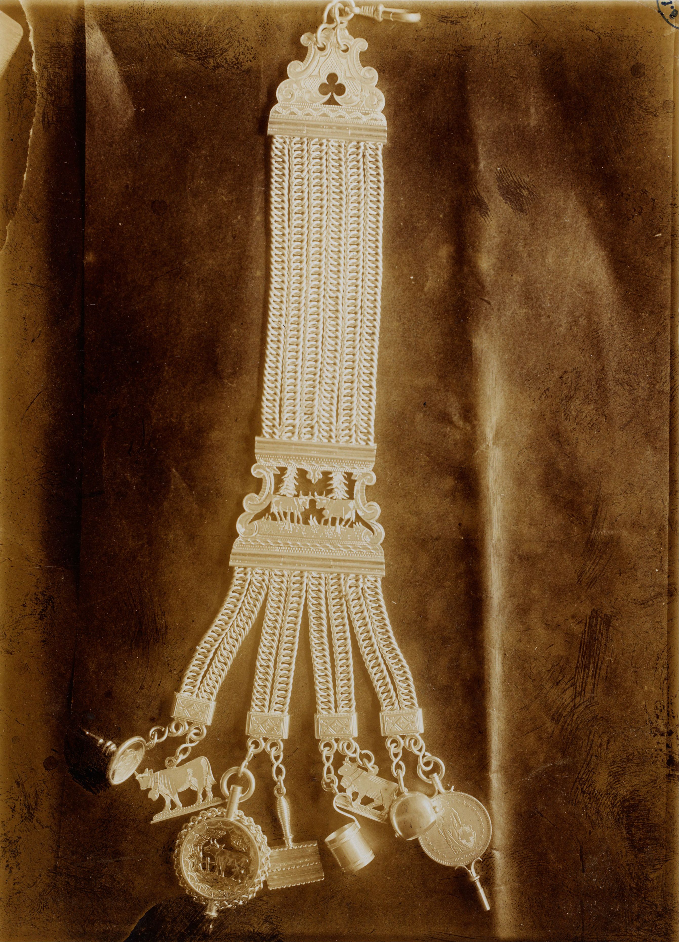 Beim Bild befindet sich folgende Notiz: Silbernes Uhrgehänge eines Toggenburger Sennen. Erklärung der Anhänger an der Uhrkette: von links nach rechts gesehen: Melchstuhl, Silberne Kuh, Grosser Uhrschlüssel, Striegel, Litermass, Silberne Kuh, Glocke und Schlüssel mit 2 Fr. Stück. Photo: Gottfr. Kuratle, Photogr. in Zürich.s. S A V k XIII (1909) H. 2, Fig.7; B 307 263 a