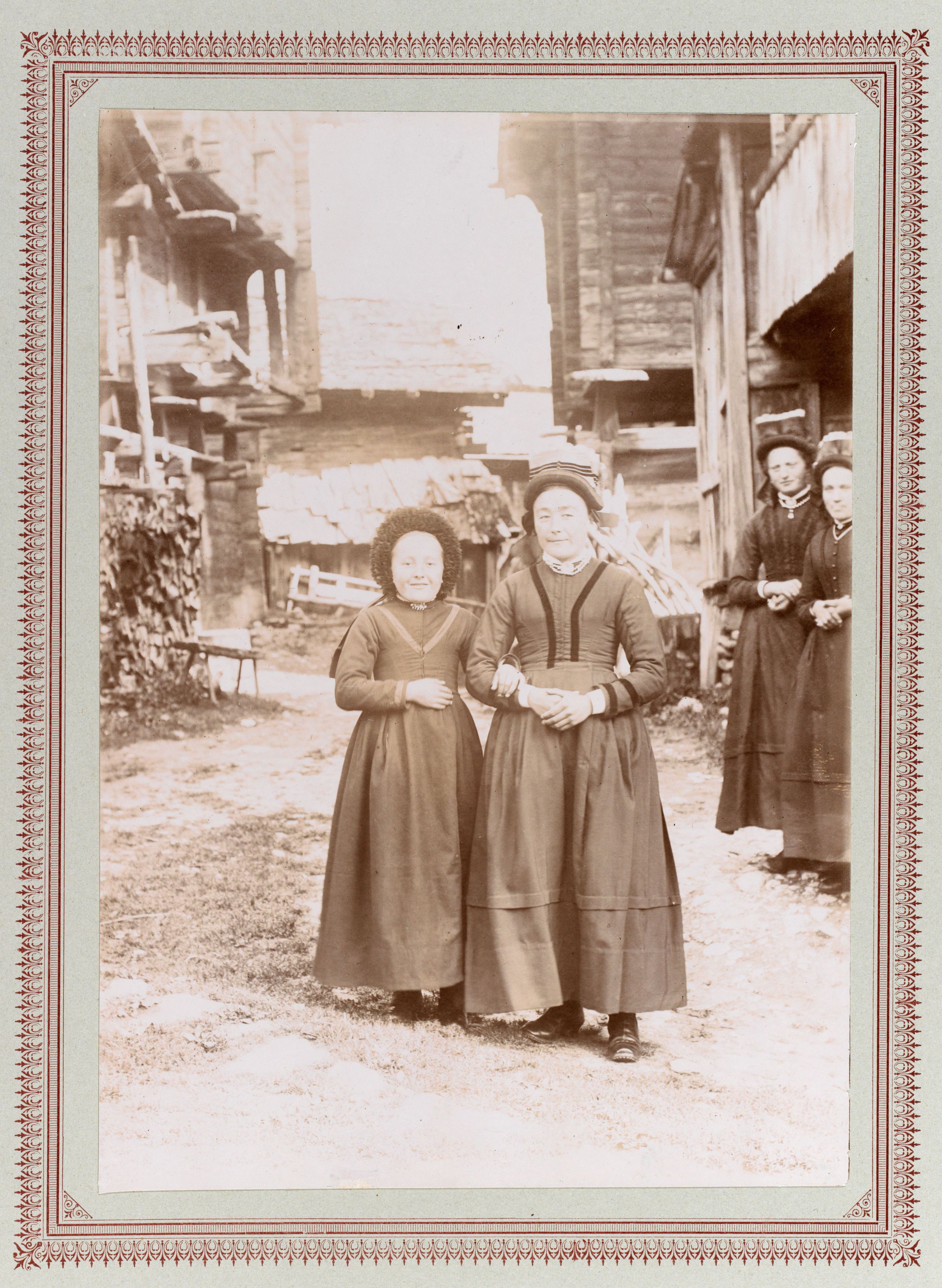 Beim Bild befindet sich folgende Notiz: Zwei Gomsermädchen in der Sonntagstracht, eines mit einer Spitzlihaube, das anderer mit dem Walliserhut.; B 2444, E 240