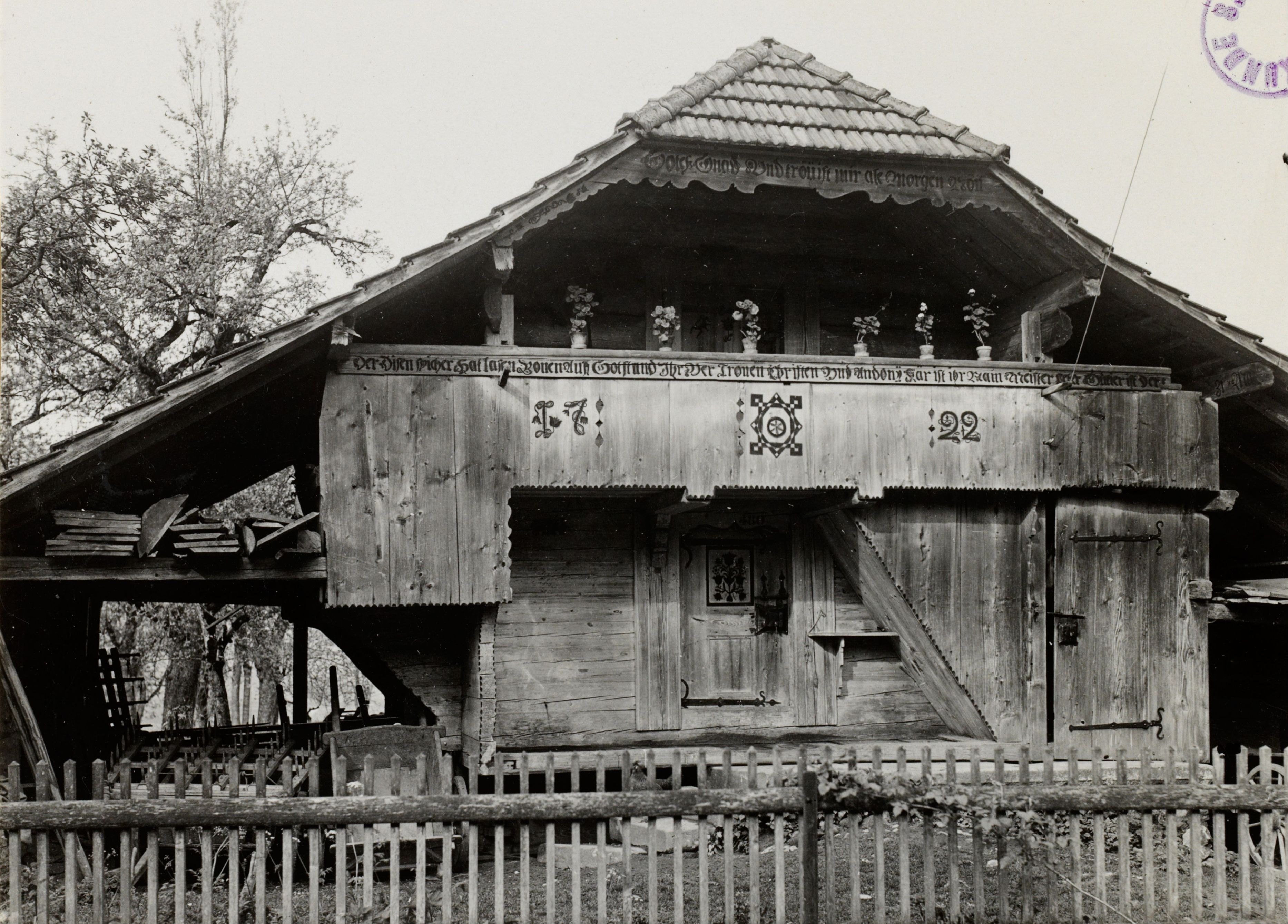 Beim Bild befindet sich folgende Notiz: Speicher Wittwer. (Ried), Inschriften: (Schwarz, Rot) Gotess Gnad Und tröü ist mir ale Morgen Nöü. Der Disen spicher Hat lasen Bouen Auff Got stand Ihr Ver Trouen Christen und Andony Kär ist ist Nam-Meister Peter Gutier ist Der Zi+Ma 1722, Anbauten neu.; Inschriften (schwarz u. rot) a. Speicher, Ried, BE; Photo: Rubi, Bern; B 2307 E 73