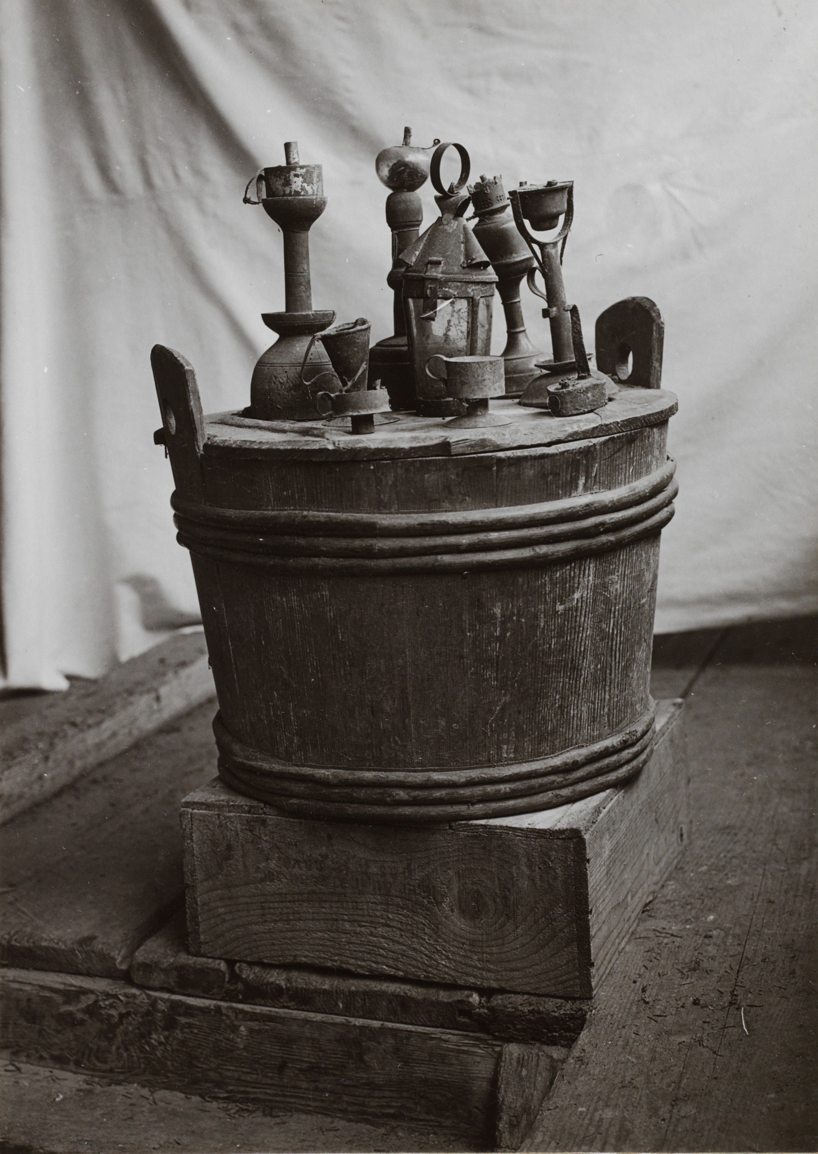 Beim Bild befindet sich folgende Notiz: Hint. Riedberg (Fam. G. Bärtschi) Salzkübel im Speicher darauf alte Lichtgegenstände: Wäbertägu, Plampitägu, Meijellatärndli, Tägustöck.; Beleuchtungskörper. Alte Lichtgegenstände, Hint. Riedberg BE; Photo: Rubi, Bern, Datum: [leer]; B 2302 E 69