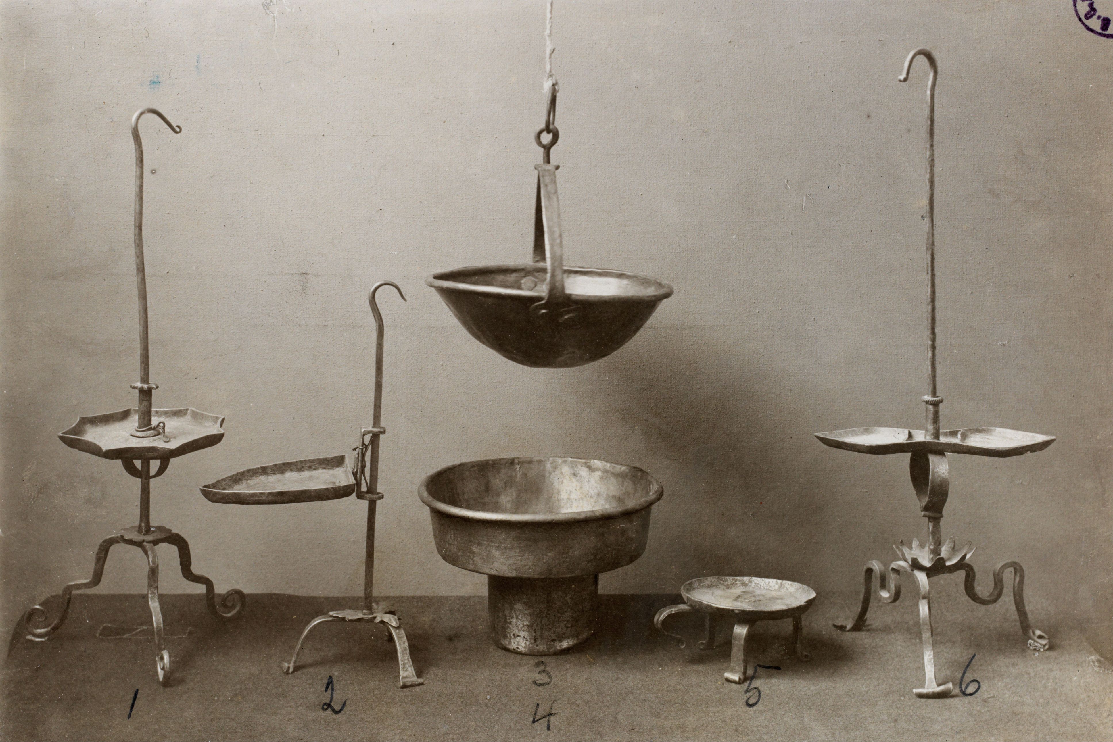 Beim Bild befindet sich folgende Notiz: BUENDNER LICHTER. 1,2,5 aus dem Münstertal. 4 Lichtkessel aus Disentis. 3 Lichtkessel aus Obersachsen. 6 Bündnerlicht aus Disentis; Sammlung: Prof. Dr. Ed. Hoffmann-Krayer, Basel November 1936; Archiv Volkskunde XIV, S. 80/81; № 1619, 69