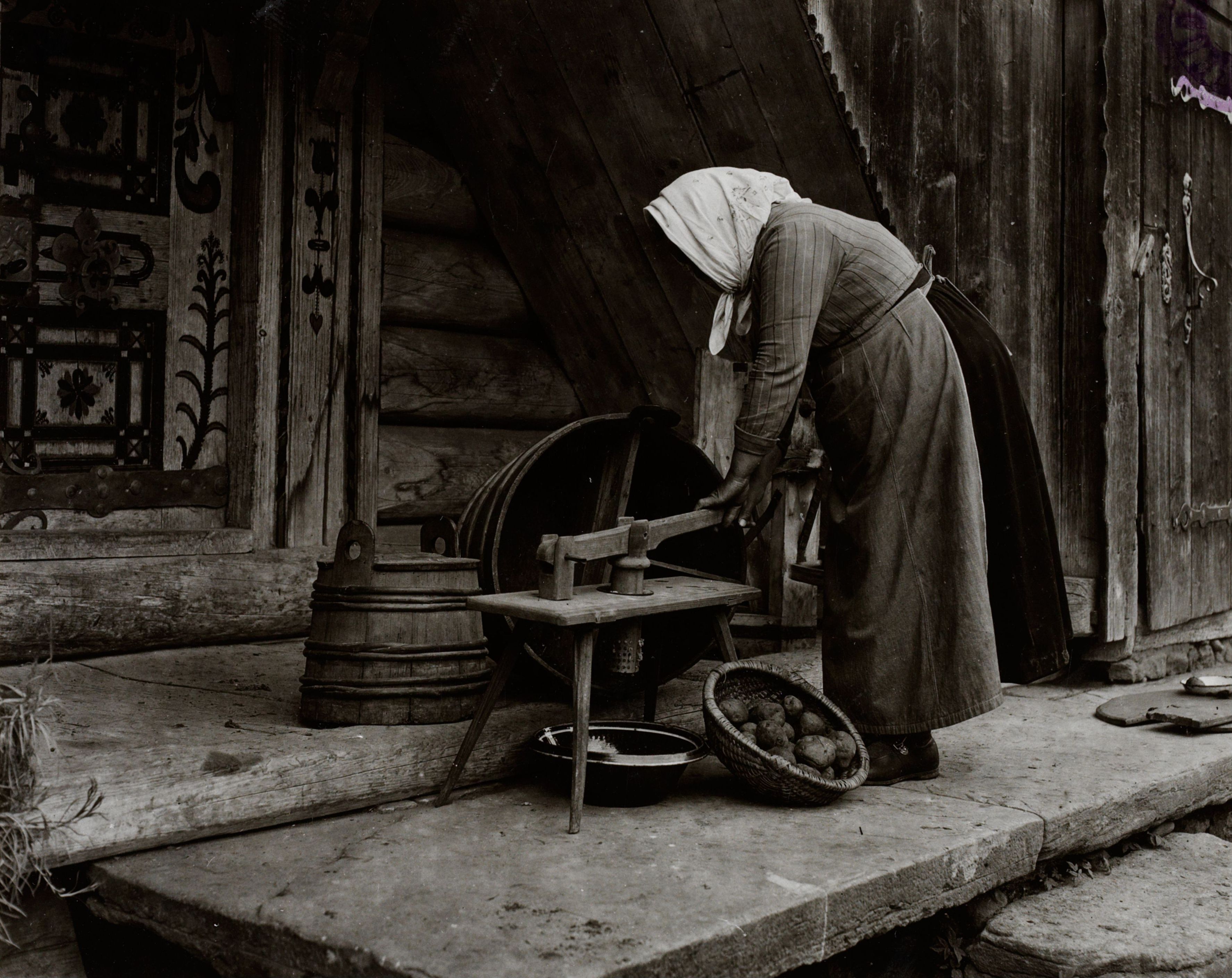 Beim Bild befindet sich folgende Notiz: Speicher Fankhauser. (Ried), "Härdöpfeldrückli", gesottene Kartoffeln wurden früher zum Dörren vermittelst Hebel und Stöpsel durch einen gelöcherten Blechzylinder gedrückt. Dahinter unterteilte Dörrobststande und "Ankenhübel", Frau Fankhauser 1934; Geräte (Haushalt) "Härdöpfeldrücki", Ried BE; Photo: Rubi, Bern; B 2301 E 66 a