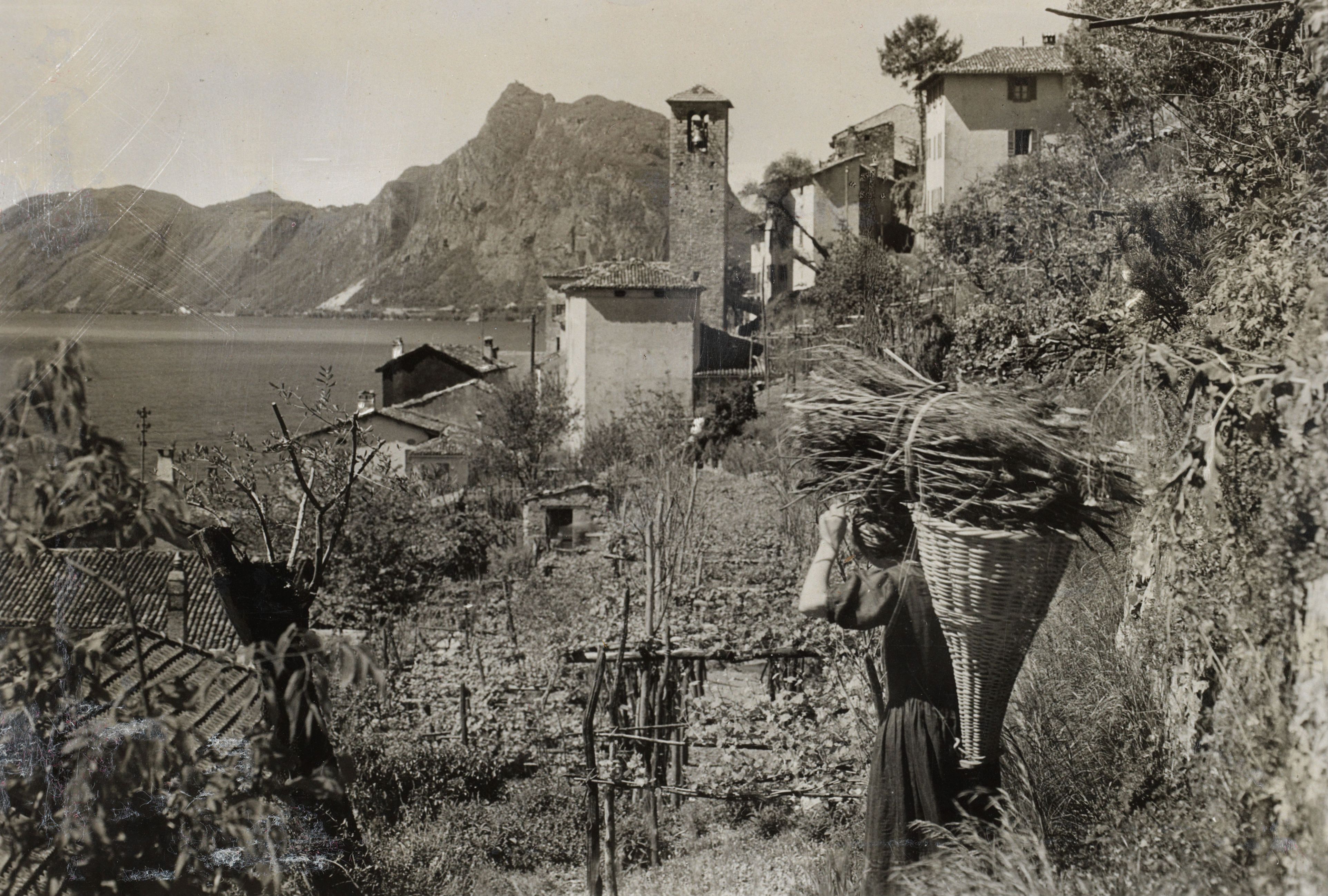 Auf der Rückseite befindet sich folgende Notiz: 33; B 599; Traggeräte; Frau mit gesammeltem Holz; TI Gandria; Photo: Herbert Rüedi, Photohouse, Lugano; No. 49.