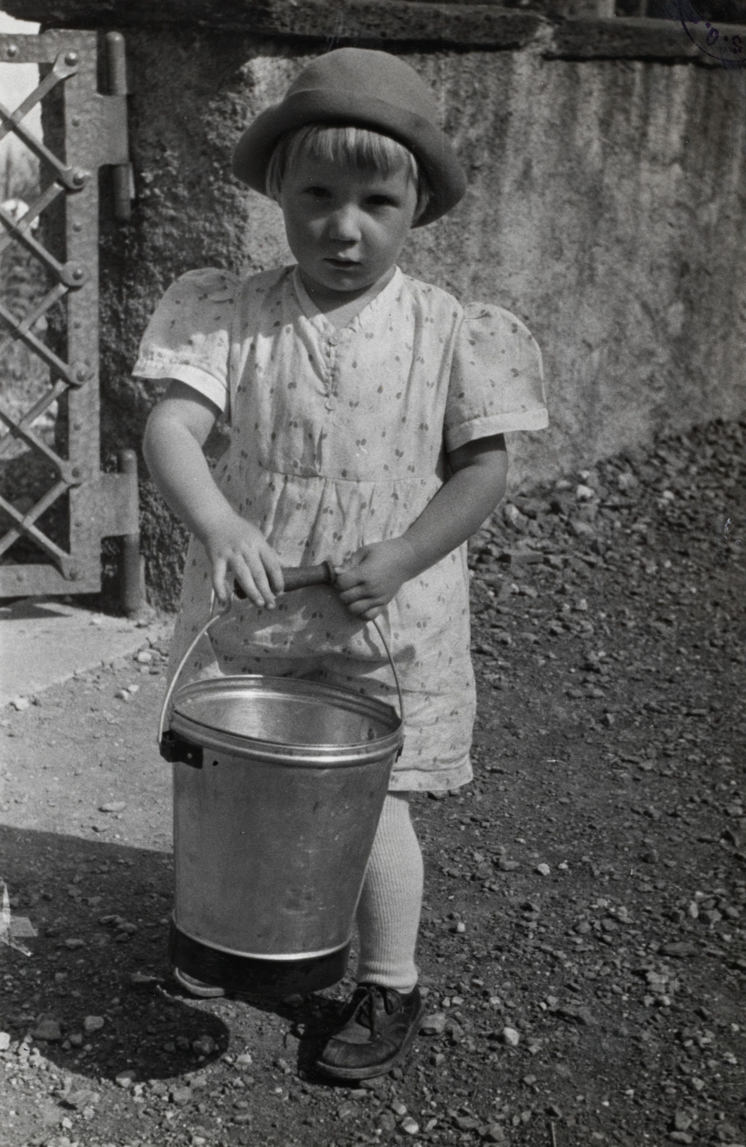 Auf der Rückseite befindet sich folgende Notiz: No 2187 b 1000; Bartholomäusschmalz; Kl. Mädchen wartet vor der Kirchentüre auf den Schmalz. SG Flums; Publ. Werkzeitung No 8, Luzern, August 1940
