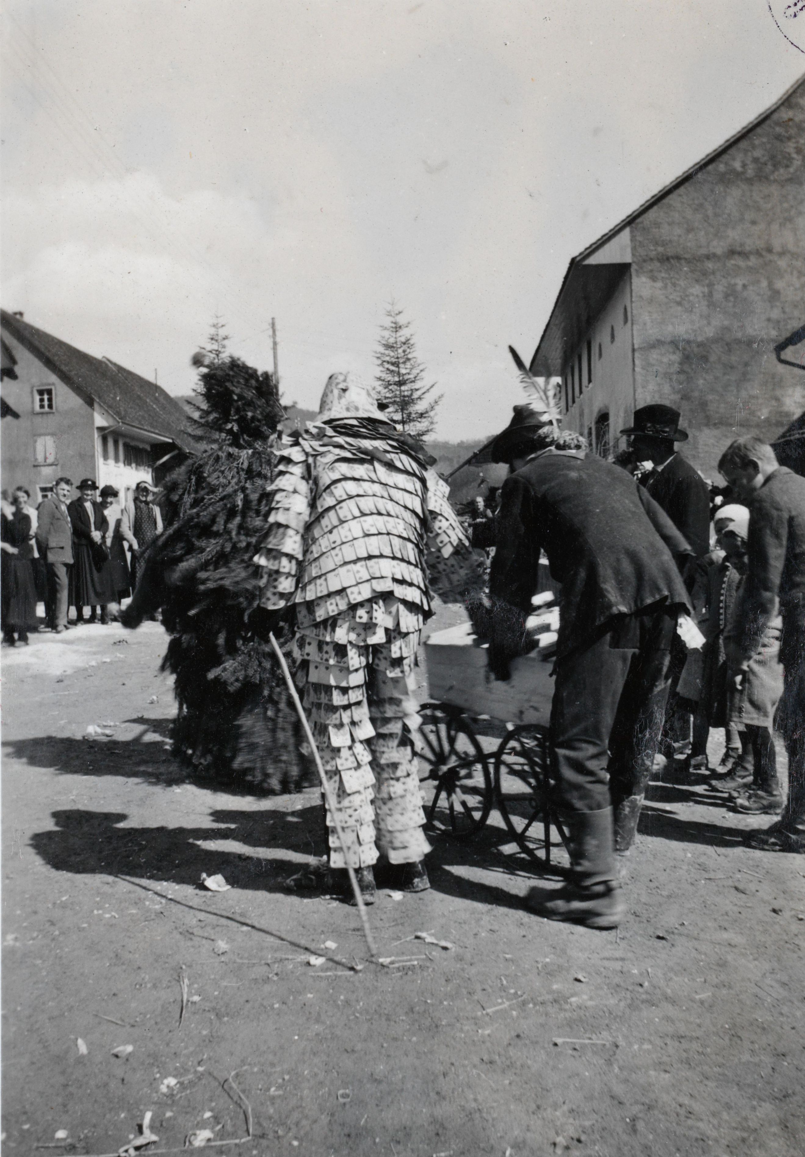 Auf der Karteikarte steht mit Schreibmaschine geschrieben: Eierlesen; Eierleset 1936 in Effingen. Abb. 1. Der Eierleser ist fertig und spaziert mit seinem Schatz das Dorf hinunter. Abb. 2. Hühnermann mit Federhut