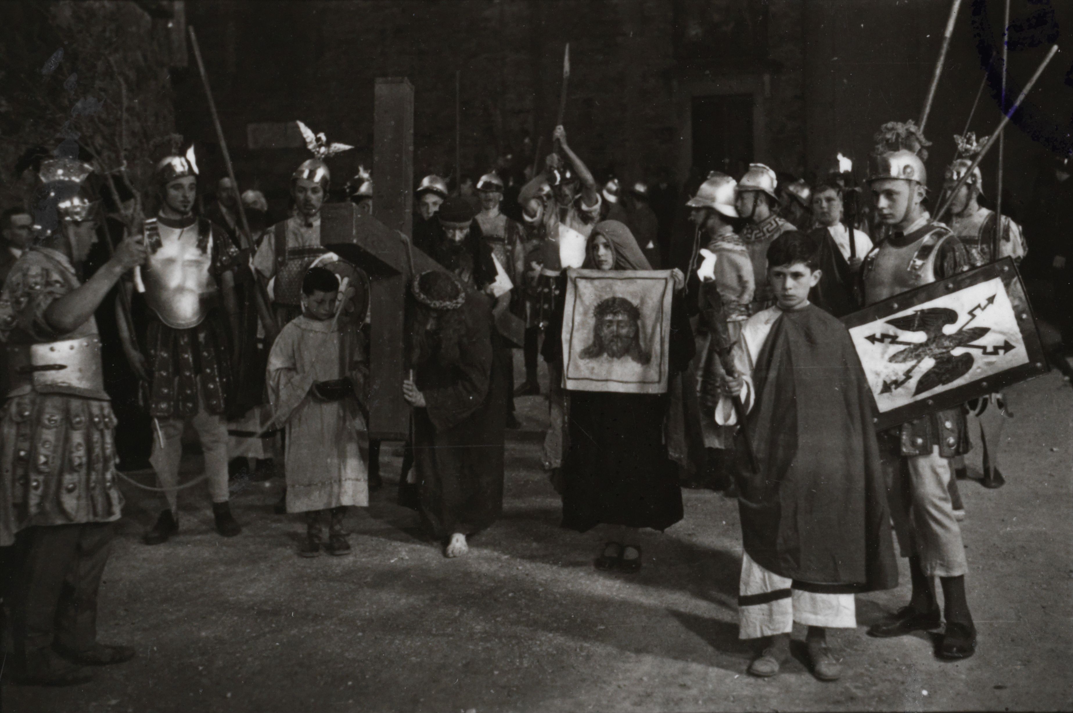 Auf der Karteikarte steht mit Schreibmaschine geschrieben: Karfreitagsprozession; Seit dem Mittelalter hat die Kirche immer wieder dem Volk Leiden und Auferstehung Christi in den Mysterienspielen vor Augen treten lassen, und manche, zum Teil prunkvolle, haben sich bis heute erhalten. Etwas Ähnliches, nur ein stummes Spiel, ist die Prozession, die am Abend des Gründonnerstags und des Karfreitags durch die Gassen von Mendrisio zieht. Die ganze Passion, der Leichnam Christi in einem schwarzen Schleier gehüllt, der kreuztragende Heiland gefolgt von Kriegsknechten, auch der heiligen Veronika mit dem Schweisstuch, düstere und farbig glänzende Gestalten stellen die heilige Geschichte lebendig dar.
