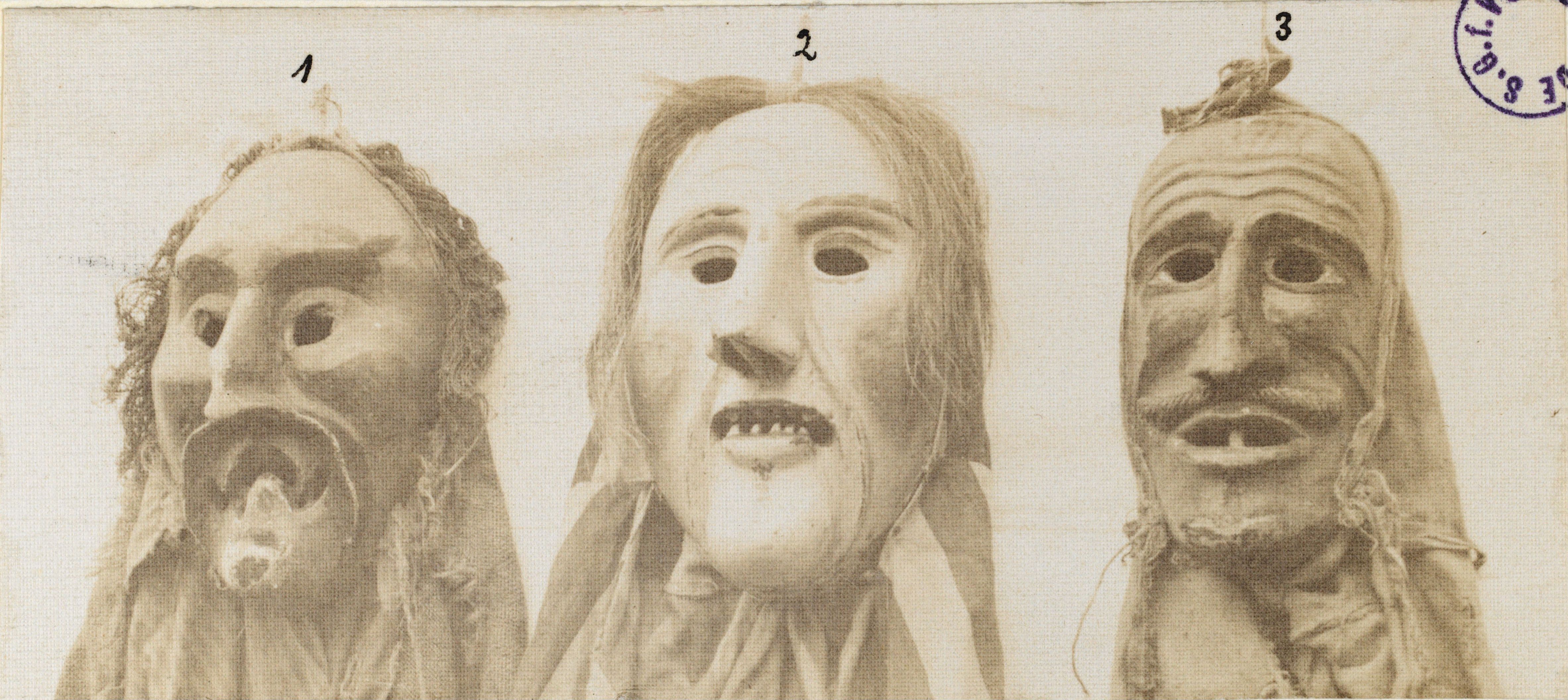 Auf der Karteikarte steht mit Schreibmaschine geschrieben: Larven (Fastnacht; Material); Holz-Larven aus Flums