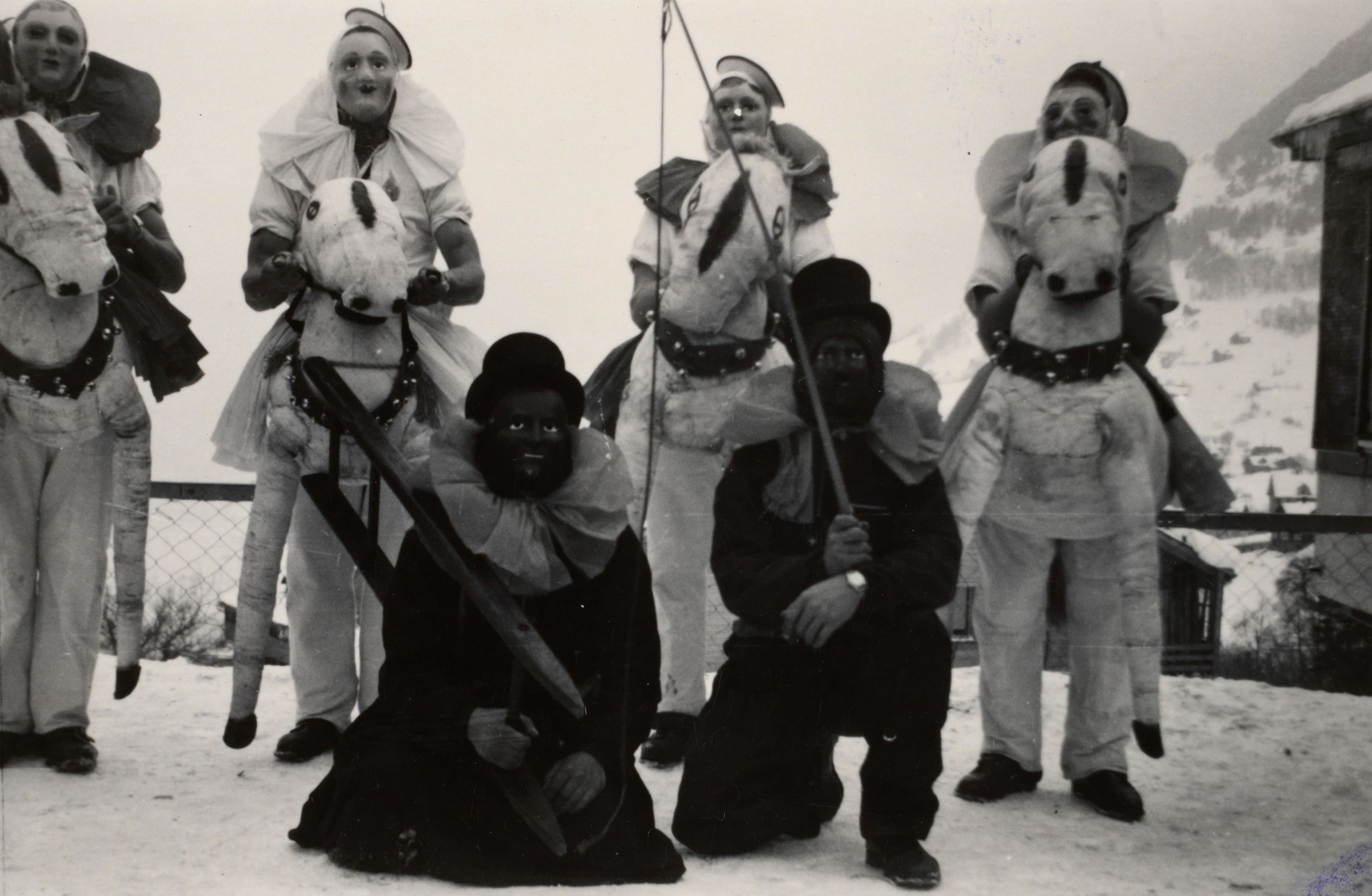 Auf der Karteikarte steht mit Schreibmaschine geschrieben: Fastnachts Umzüge; Einmaliger Fastnachtsumzug in den 30er Jahren