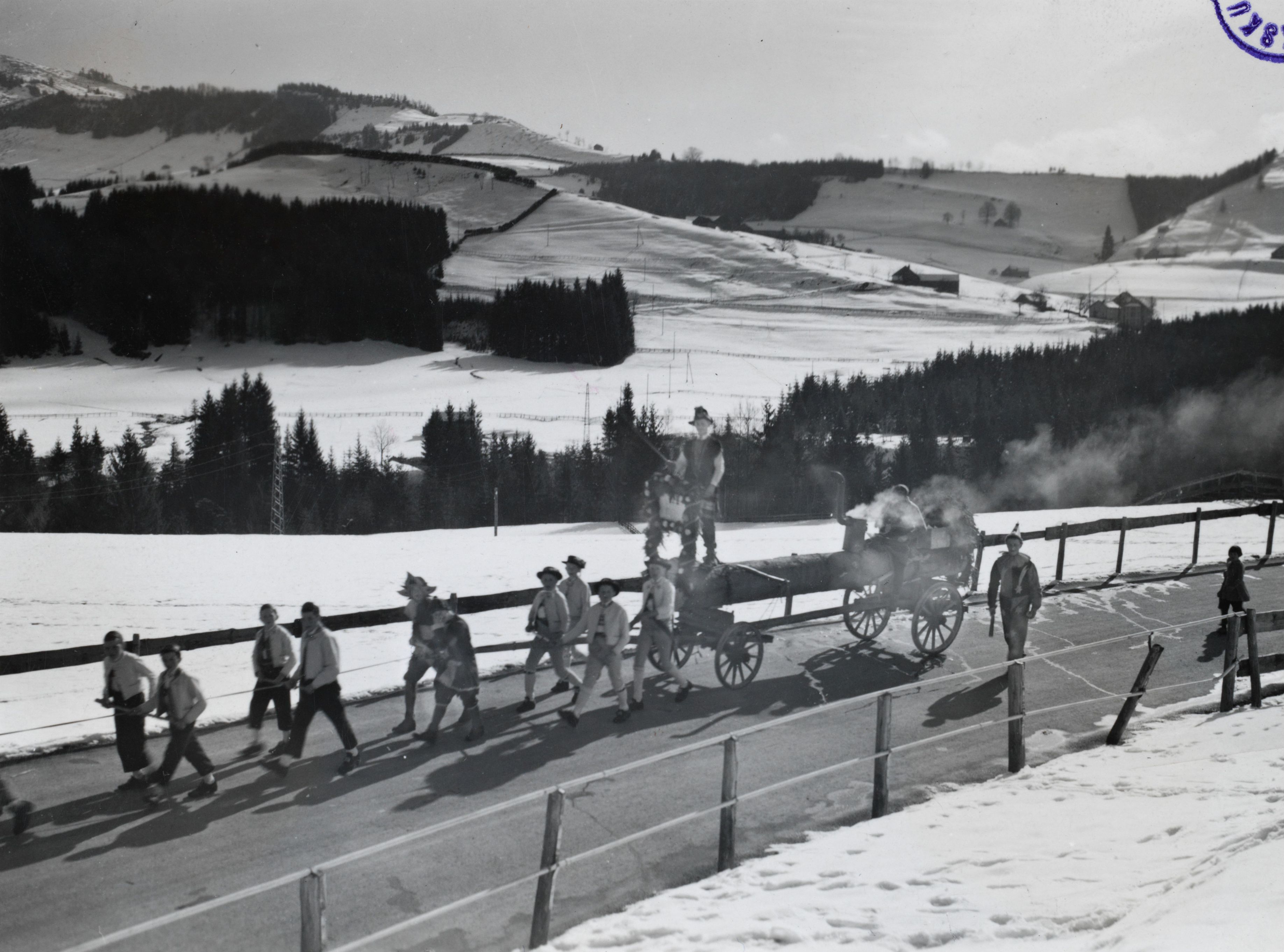 Auf der Rückseite befindet sich folgende Notiz: "Bloch-Montag" im Appenzellerland. Die "Blochfuhr" der Buben von Hundwil.; Contessa Photo Dr. Moser; 1 1/2 Spalten II; E 845 B 2237; 18; Zahlung für Reproduktion der Photo an Dr. Fritz C. Moser: Postcheck-Konto VIII. 10589