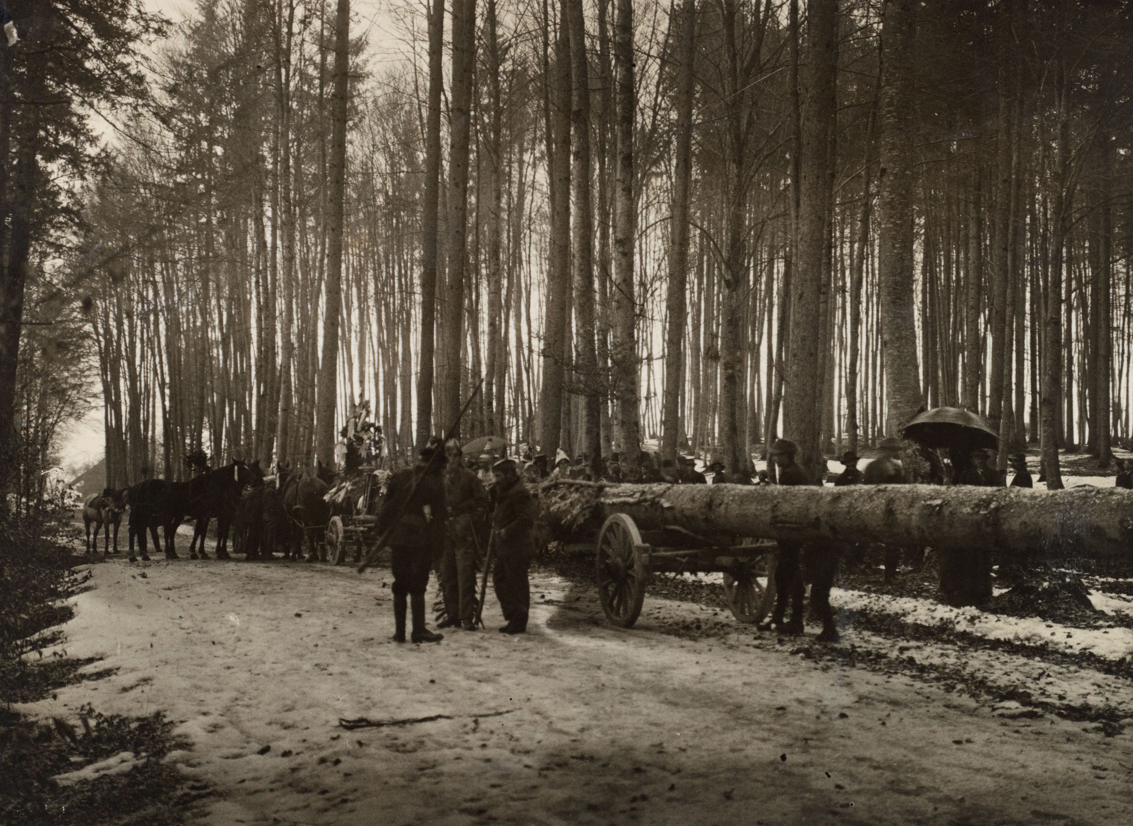 Auf der Karteikarte steht mit Schreibmaschine geschrieben: Umzüge (mit Block); Hirsmontagstanne; "Eine Art Umzug kann auch die Tannenfuhr oder das Blockfest genannt werden, wie es sich bis in unser Jahrhundert in einzelnen Gegenden der Schweiz erhalten hat. Bericht haben wir aus den Kantonen Appenzell, St. Gallen, Zürich und Bern. Mit mehr oder minder wesentlichen Abweichungen ist der Verlauf ungefähr der, dass die Jungmannschaft sich an einem bestimmten Tage aufmacht, um im benachbarten Walde einen genau bezeichneten Stamm zu holen, der dann im Triumph durch die Ortschaft gezogen wird." (Aus "Fasnachtsgebr. in der Schweiz" von E. Hoffmann-Krayer, SAVk, I, (1897) 269 f.)