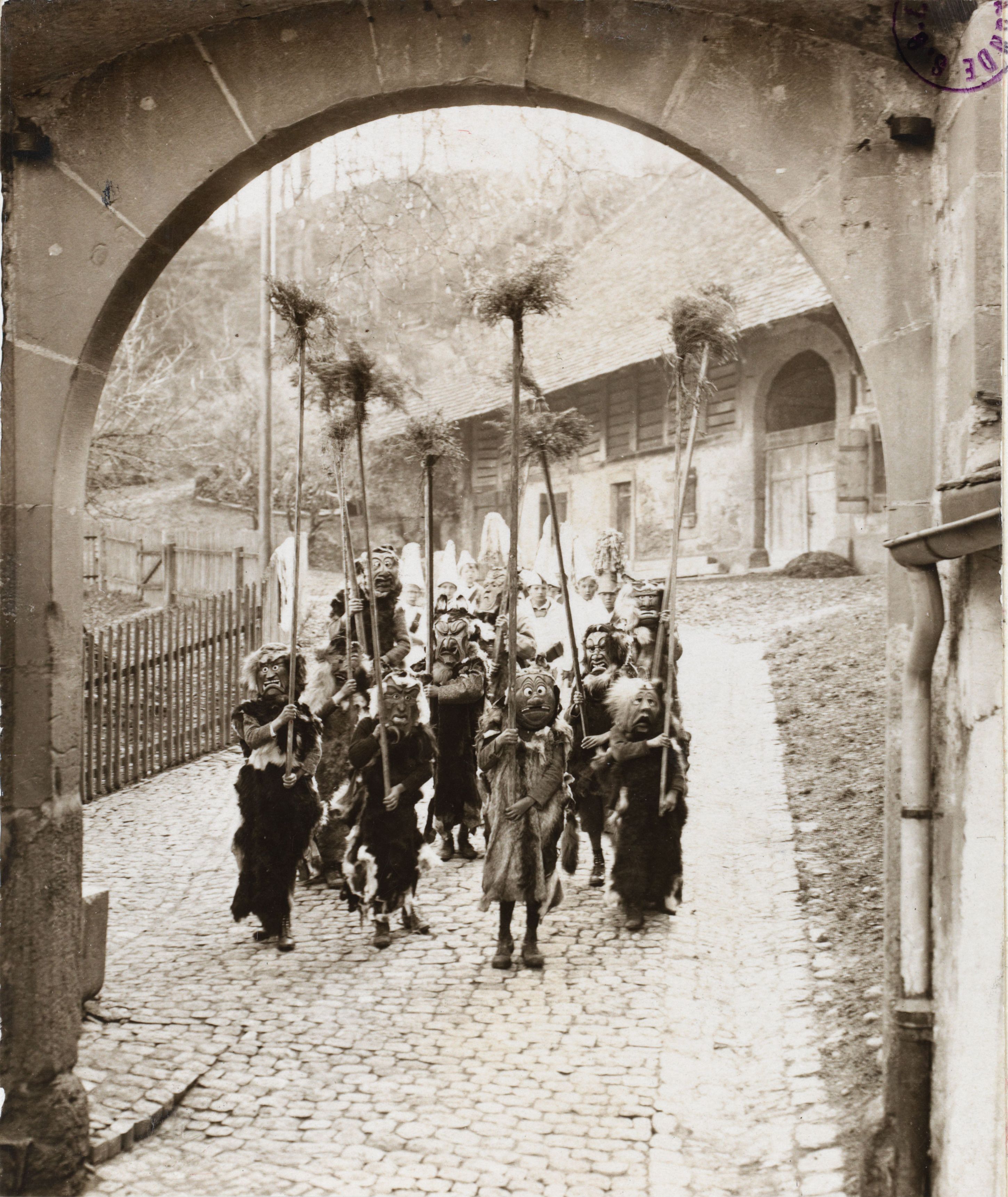 Auf der Karteikarte steht mit Schreibmaschine geschrieben: Achetringele; Der Zug der Achetringeler bewegt sich ins Städtchen hinein. Voran gehen Gestalten mit dämonisch verzerrten riesigen Gesichtern; sie tragen Wacholderbesen an langen Stangen.