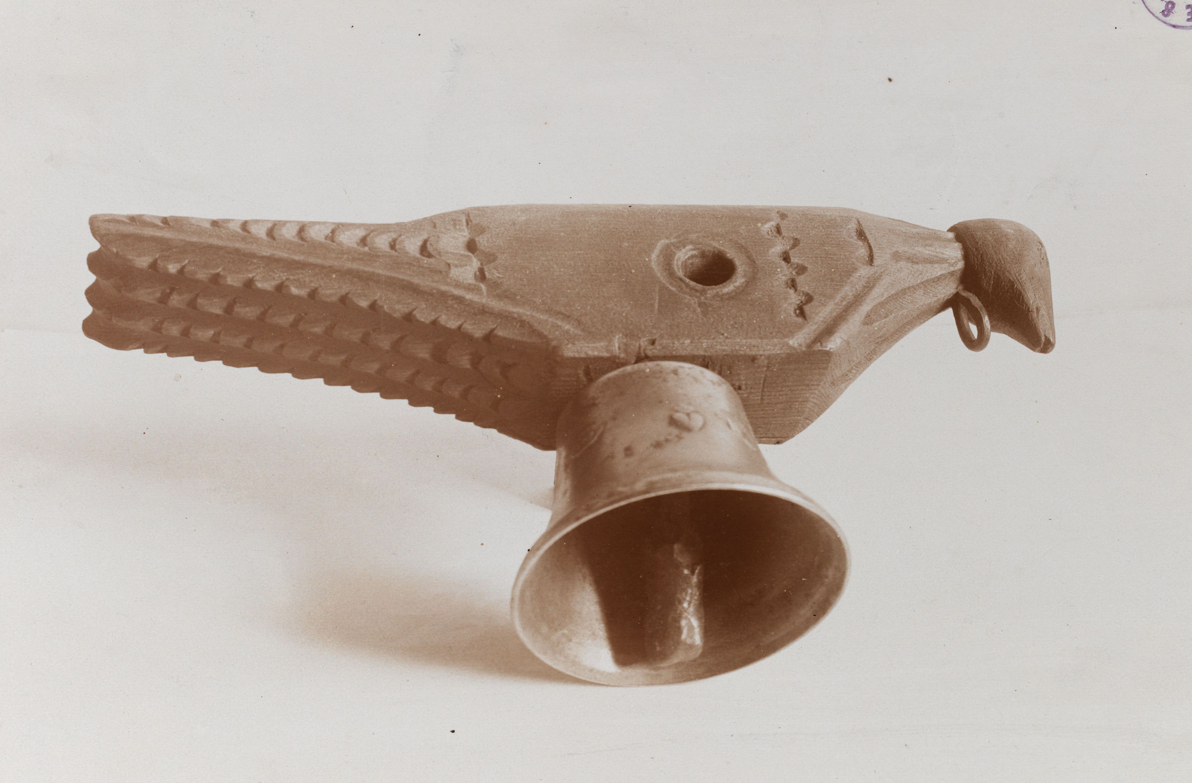 Auf der Karteikarte steht mit Schreibmaschine geschrieben: Glocken; Chorglöcklein, das an einer stylisierten Holztaube befestigt ist (Original im Historischen Museum in Basel)