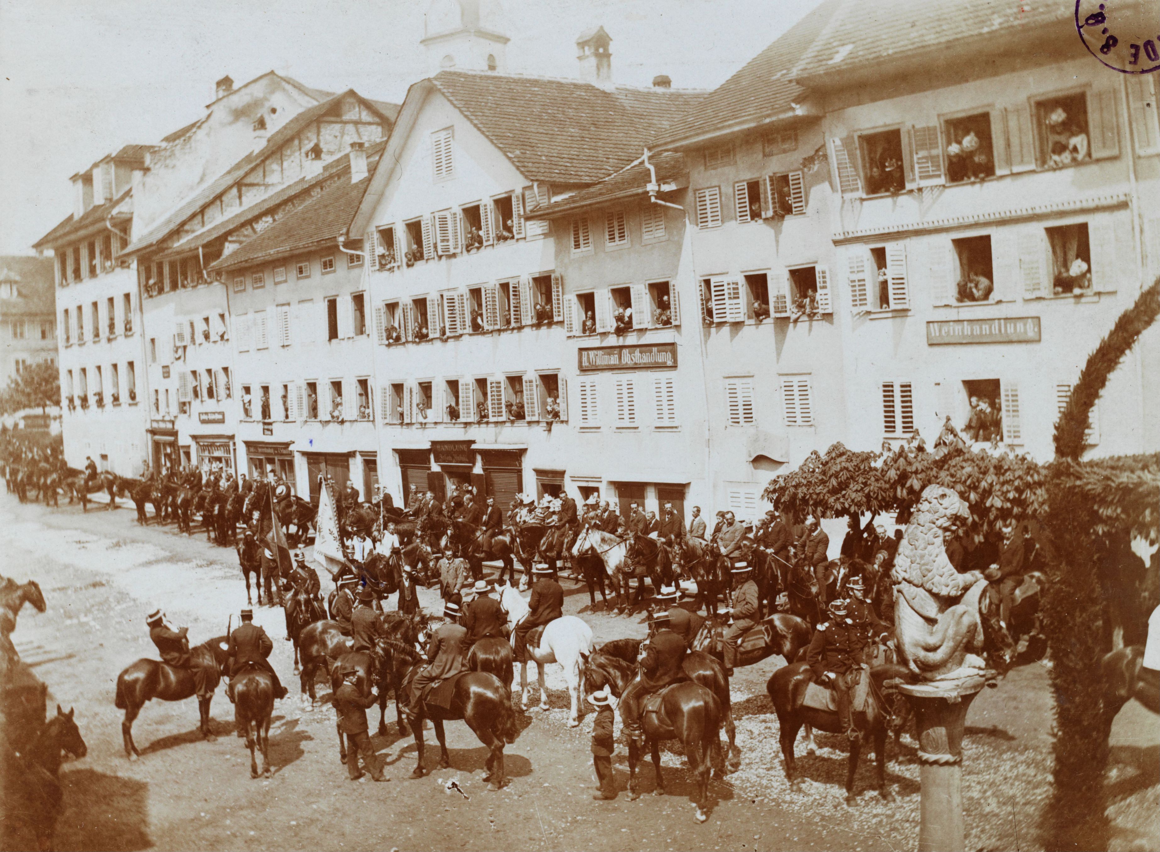 Auf der Rückseite befindet sich folgende Notiz: No 1517 705; Auffahrtsumritt Feierlicher Choral zu Pferde; LU Sempach; Photo: A. Schaller-Donauer