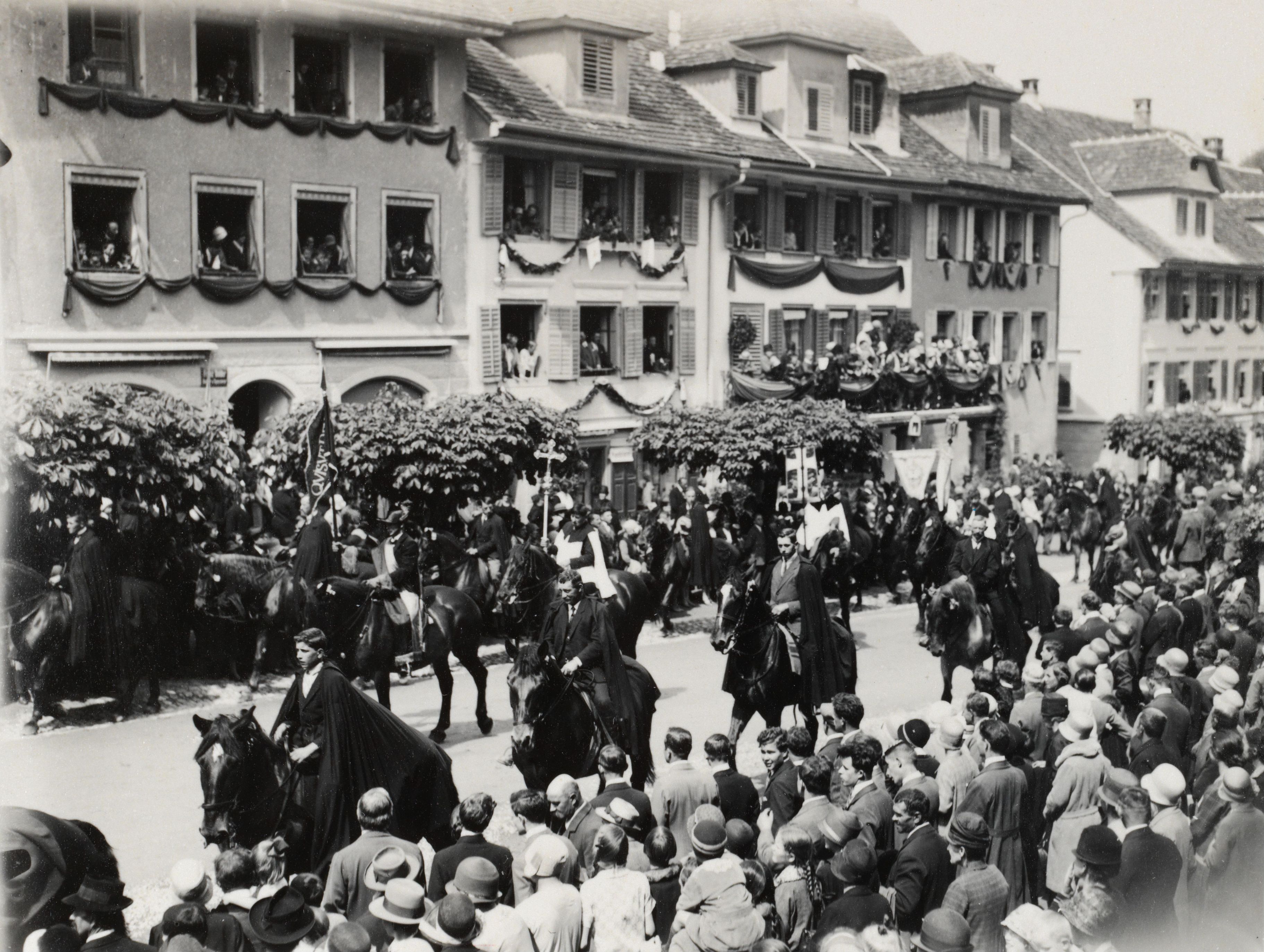 Auf der Karteikarte steht mit Schreibmaschine geschrieben: Umzüge, Umritte (Kirchenfeste); Umritt. Kreuz und Fahnen werden dem Zug voran getragen.