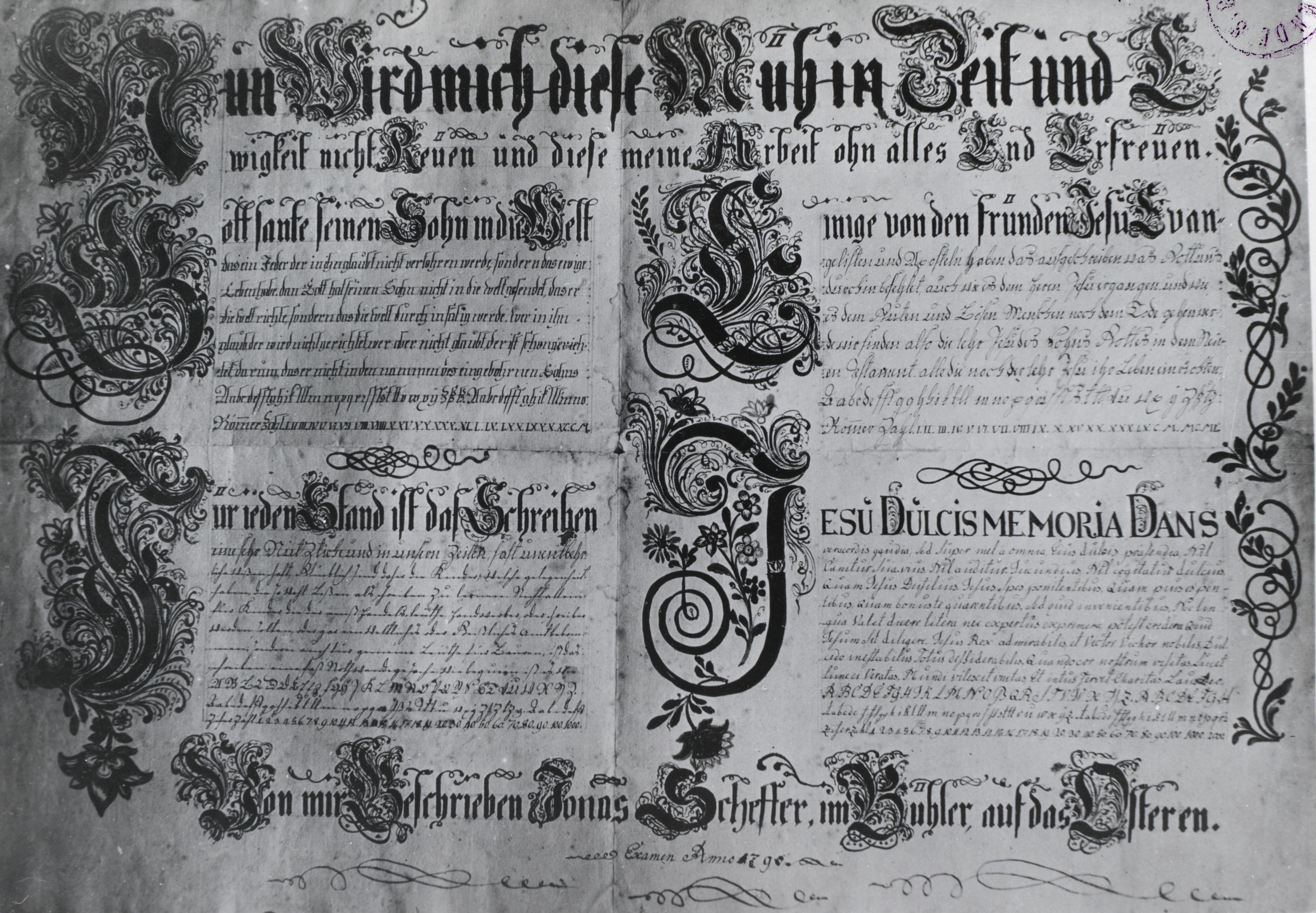 Auf der Rückseite befindet sich folgende Notiz: Auf Rückseite: Stans; 683; B 91 683; 23 II; Bäuerische Kunst Appenzeller Arbeit "Probeschrift" Die grossen Buchstaben sind in Farben gemalt und teilweise vergoldet. Natürliche Grösse 24 + 30 ctm; 7; Besitzer: U. Steiger Antiquar St. Gallen