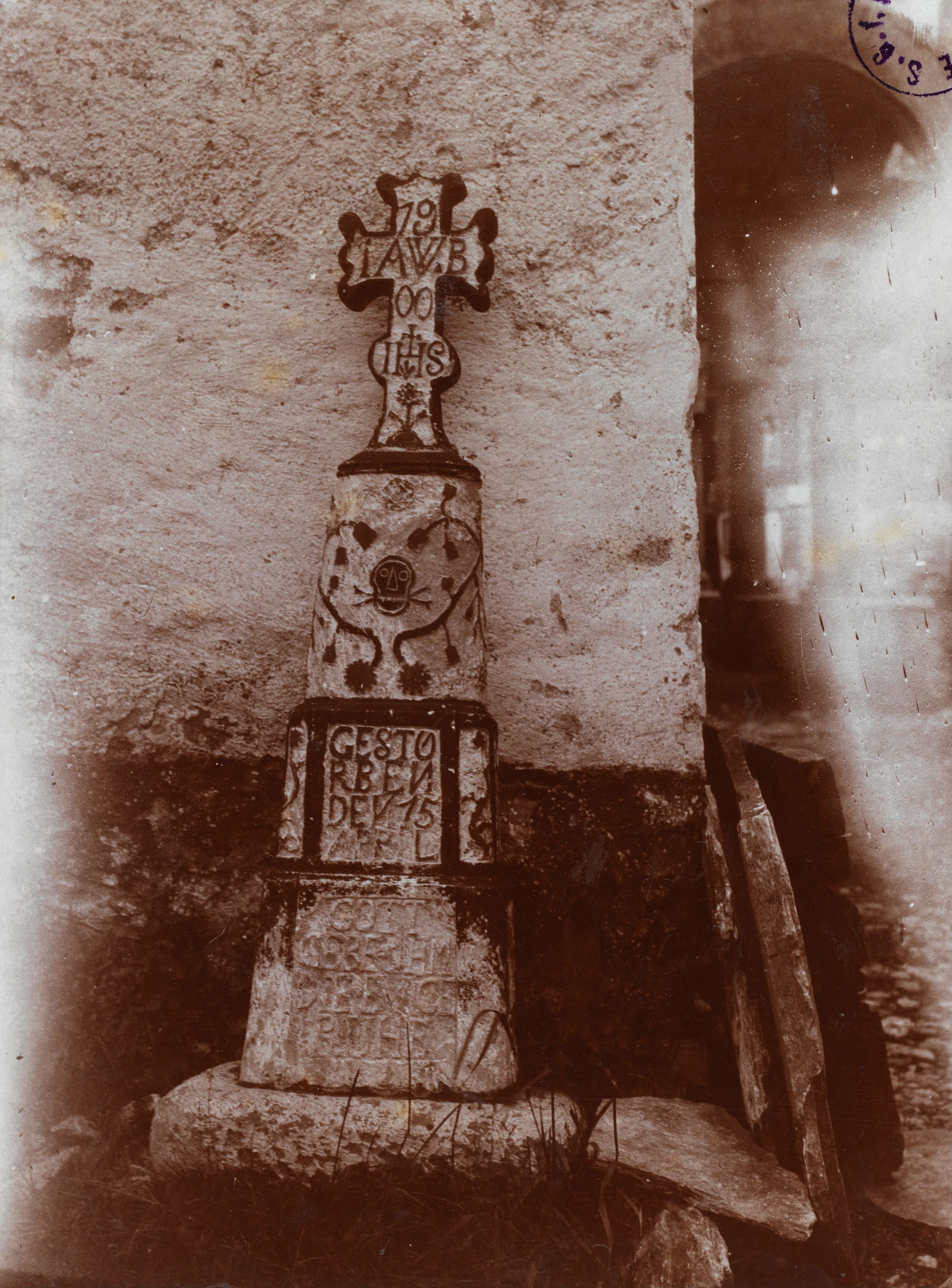 Auf der Karteikarte steht mit Schreibmaschine geschrieben: Grabschmuck; selbstgefertigter Grabstein eines Ofenmachers; s. auch No. 1383 u. 1383 b