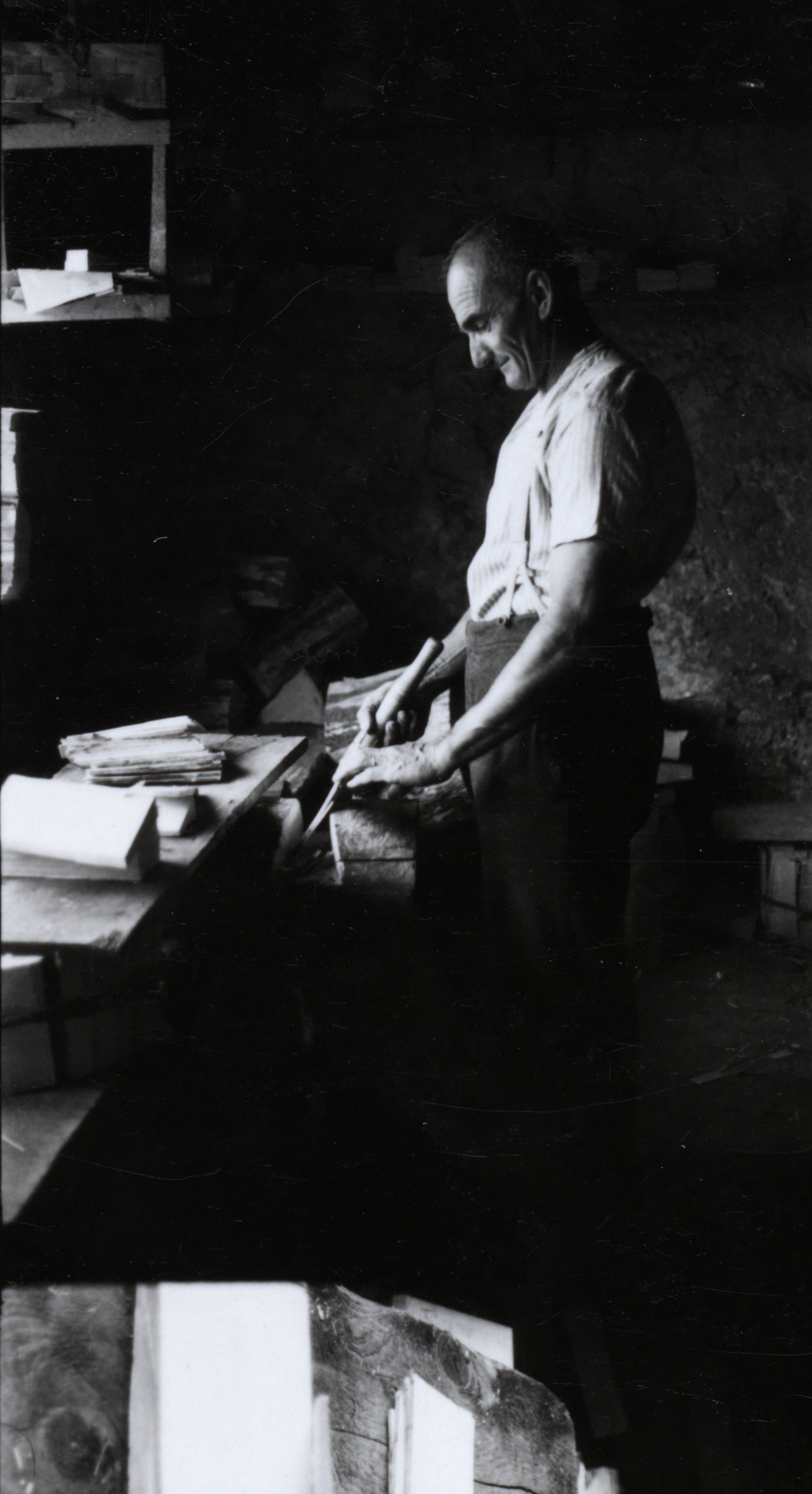 Auf der Karteikarte steht mit Schreibmaschine geschrieben: Schindelmachen (Text siehe Hugger, Amden S. 109-111)