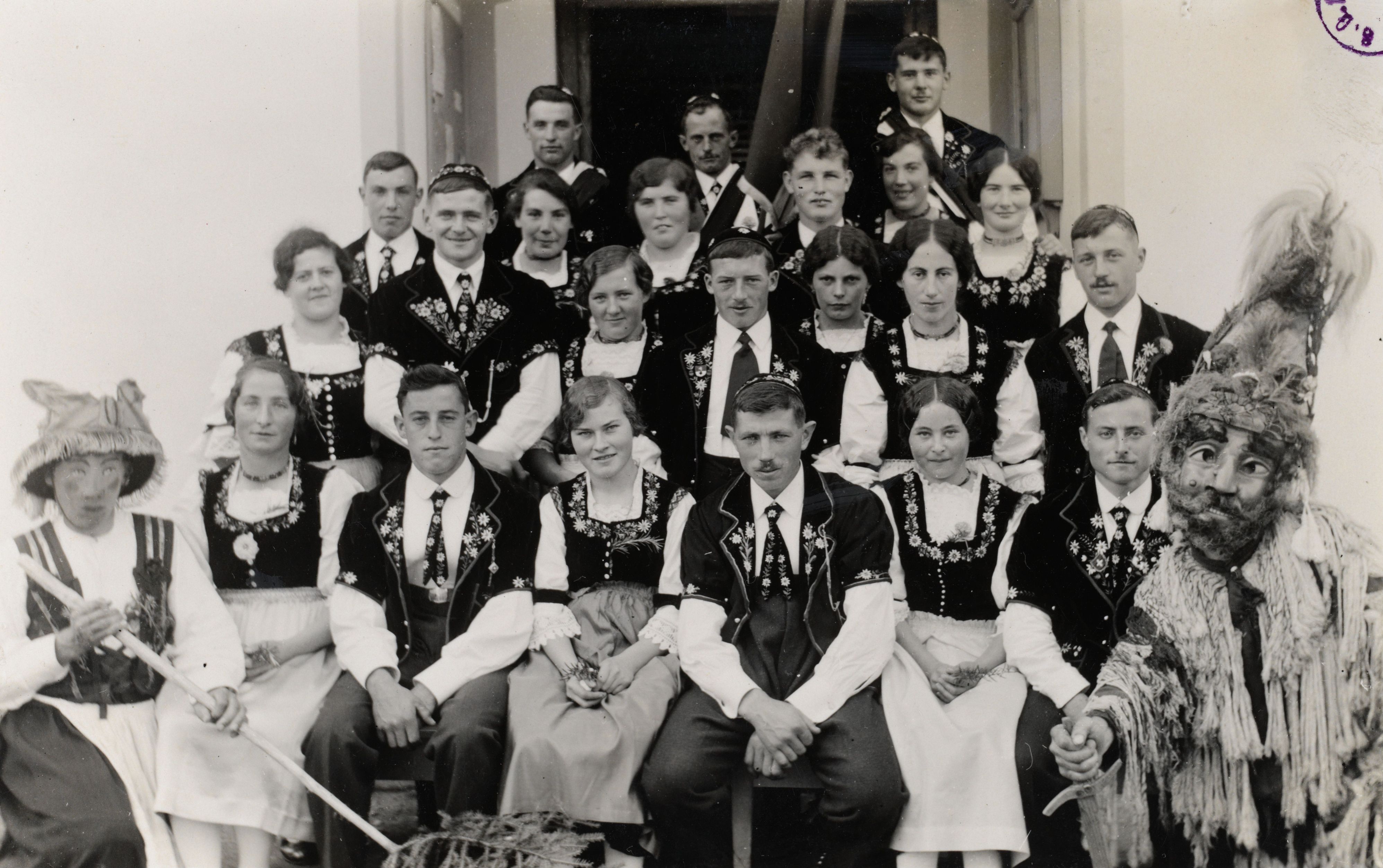 Auf der Karteikarte steht mit Schreibmaschine geschrieben: Älplerfest; Älplerchilwi; die Ledigen-Teilnehmer [und Teilnehmerinnen]