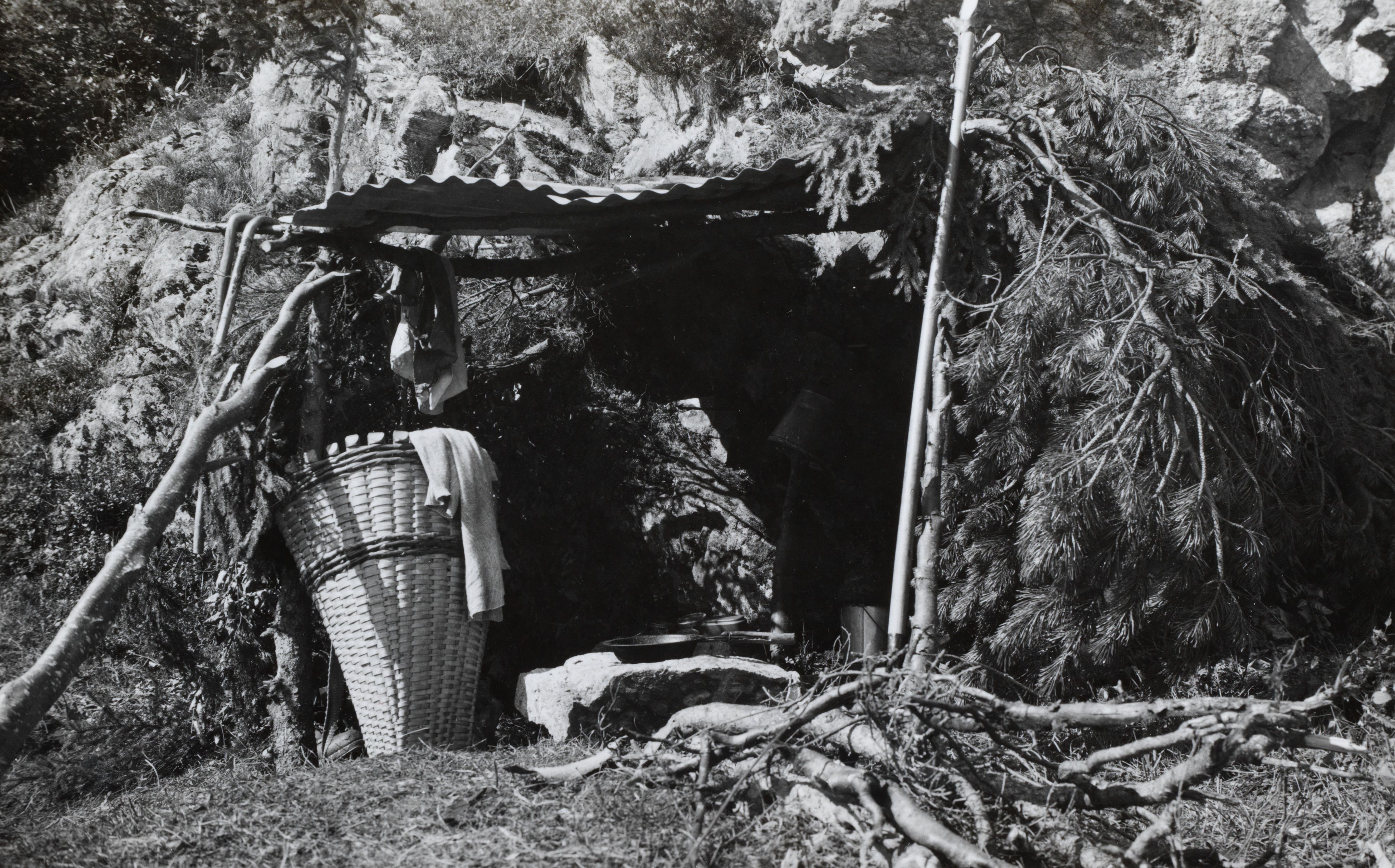 Auf der Karteikarte steht mit Schreibmaschine geschrieben: Wildheu; Wildheuerhütte am Buchenegg aus einem Wellblech und grünen Ästen