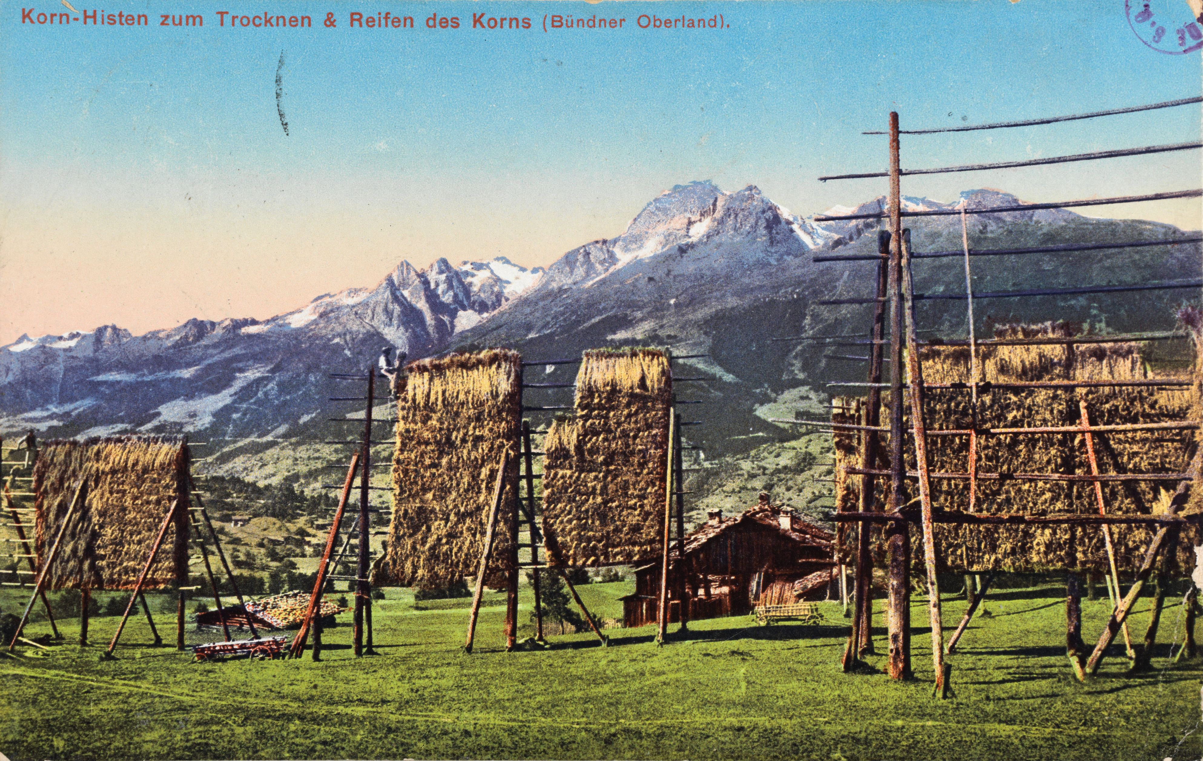 Notiz im Bild: Korn-Histen zum Trocknen & Reifen des Korns (Bündner Oberland).