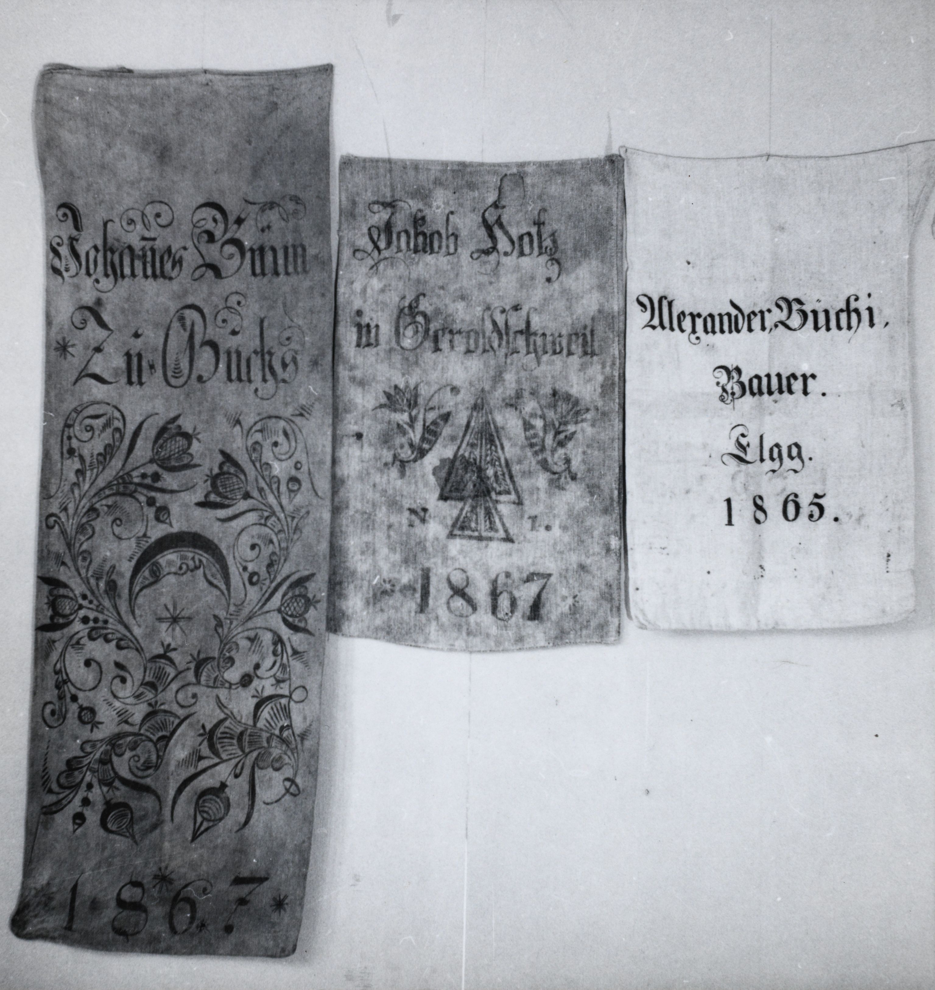 Notiz im Bild: [Sack links:] Johannes Baum Zu Buchs 1867; [Sack mitte:] Jakob Hotz in Geroldschweil 1867; [Sack rechts:] Alexander Büchi. Bauer. In Elgg. 1865.